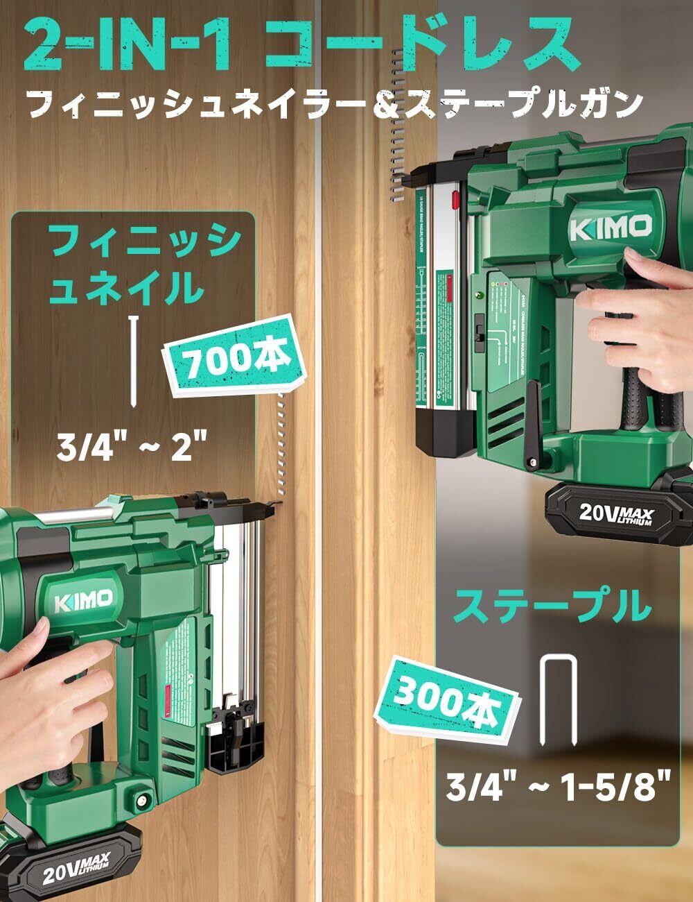 KIMO 電動タッカー 強力 充電式タッカー 電動 釘打ち機 ピンタッカー フィニッシュネイル*700本 ステープル300本 1台2役 肩幅4mm 2.0Ahバッテリー*2 空気ポンプ必要ない 誤射防止安全ロック機能 打ち込み深さ調整 単発連続切替可能 LEDライト搭載 タッカーガン 電動たっかー 木材用 軽量2.8kg DIY 石膏ボード打ち内装用 棚製造家具木工用 QM-9418 PSE認証済