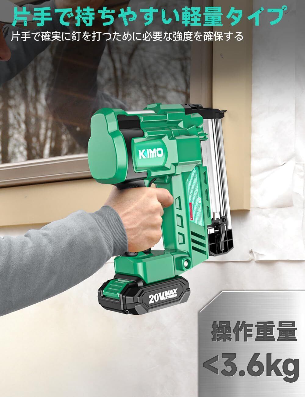 【大容量2.0Ahバッテリー*2&LEDライト|タッカーに求められる信頼性と実用性を搭載】KIMOの充電式タッカーは、20V/2.0Ahの大容量リチウムイオンバッテリーを搭載し、一度の充電で約700本ものネイルを連続打込み可能。さらに、1000回以上の充電サイクルに対応する高い耐久性を持ち、長期間にわたって安定した性能を発揮します。これにより、現場での作業中断を最小限に抑え、効率的な工程管理が実現できます。また、バッテリー残量表示機能を標準装備しているため、いつでもバッテリー状況を確認でき、突然の切れによる作業停止のリスクを回避。安心して現場に集中できる、プロ仕様の高信頼タッカーとして設計されています。さらに、このタッカーには2つの高輝度LEDライトを装備。暗い室内や屋外、照明の少ない現場でも、作業部分を明るく照らし出します。正確な打ち込み位置を確保し、安全性と作業精度を同時に向上させる設計です。コードレスだからこそ叶う自由度と、長時間使用にも耐える実力を兼ね備えたこのタッカー。建築現場、家具製造、リフォーム、DIYなど、さまざまなシーンにおいてあなたの作業を強力にサポートします。