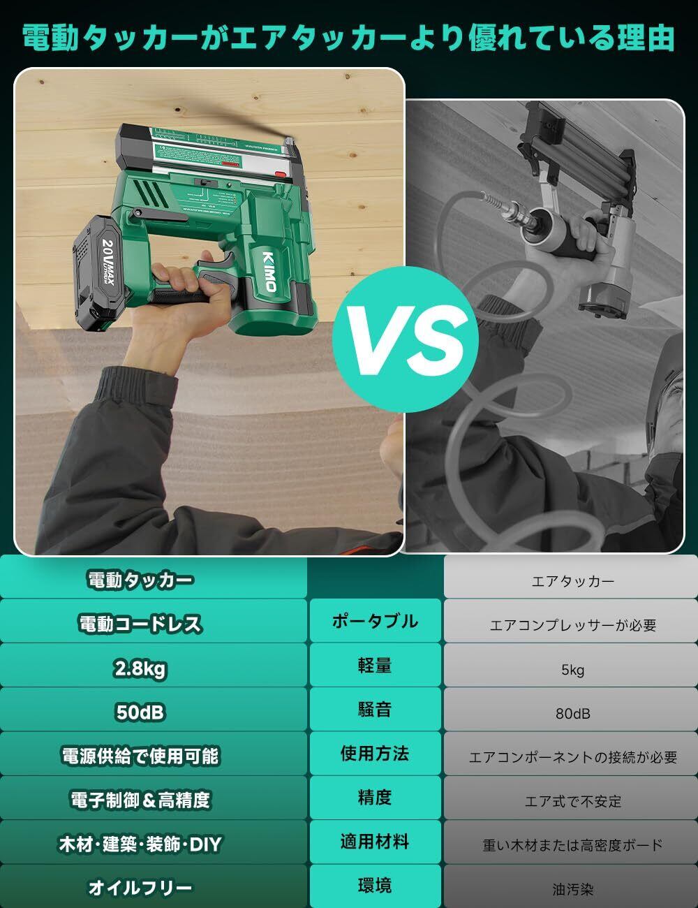 【電動タッカー vs エアタッカー|コードレスでどこでも使える新時代の打込工具】伝統的なエアタッカーは強力な駆性能が魅力ですが、空気圧装置やホースが必要で、現場への移動や設置に手間がかかります。一方、本製品の電動タッカーは20V 2.0Ahリチウムイオンバッテリーを搭載し、コードレス&コンプレッサー不要で、屋外や電源のない現場でも自由に作業が可能です。最大打込速度は連打時80本/分と実用十分で、単発・連発の2モード切替により、繊細な作業から大量打込まで対応。さらに、LEDライト付きで暗い場所でも作業視界を確保します。また、ステープル(4×19〜40mm)300本とフィニッシュネイル(20〜50mm)700本を収容可能。釘深さ調整機能や空打ち防止装置も標準搭載で、安全性と実用性を両立。重さは本体2.8kg+バッテリー0.8kg×2と軽量設計で、長時間の作業でも負担が少なく快適です。プロ仕様にも対応するこの電動タッカーなら、現場の機動性と効率を大幅にアップさせます。