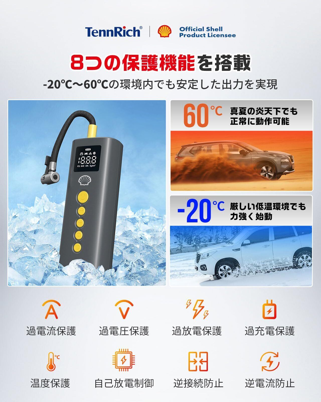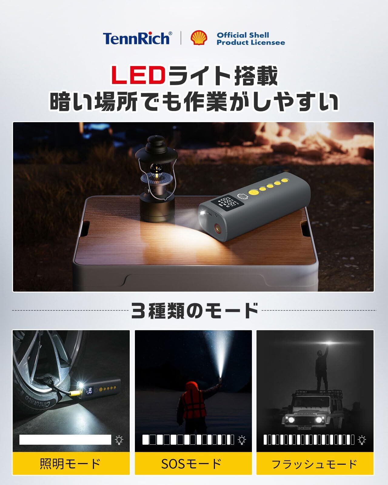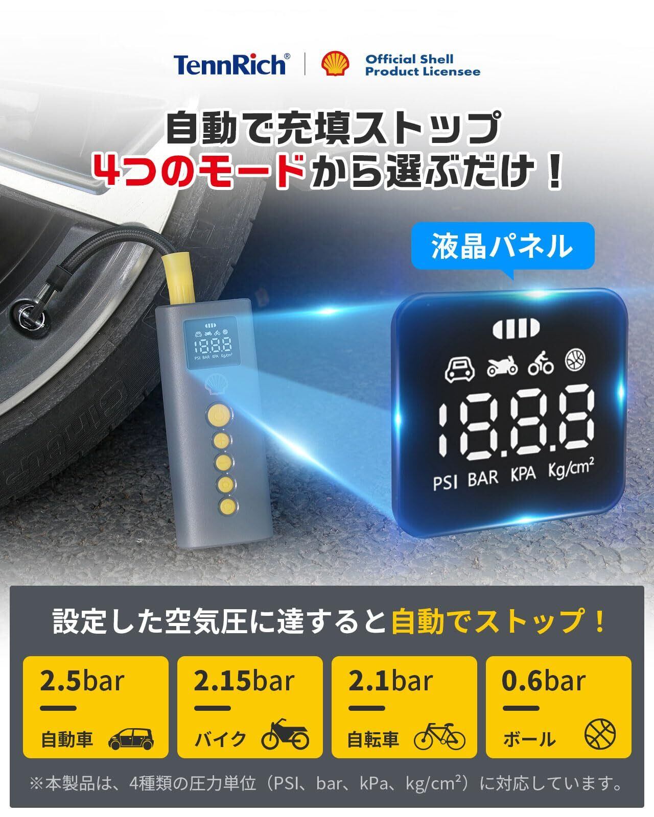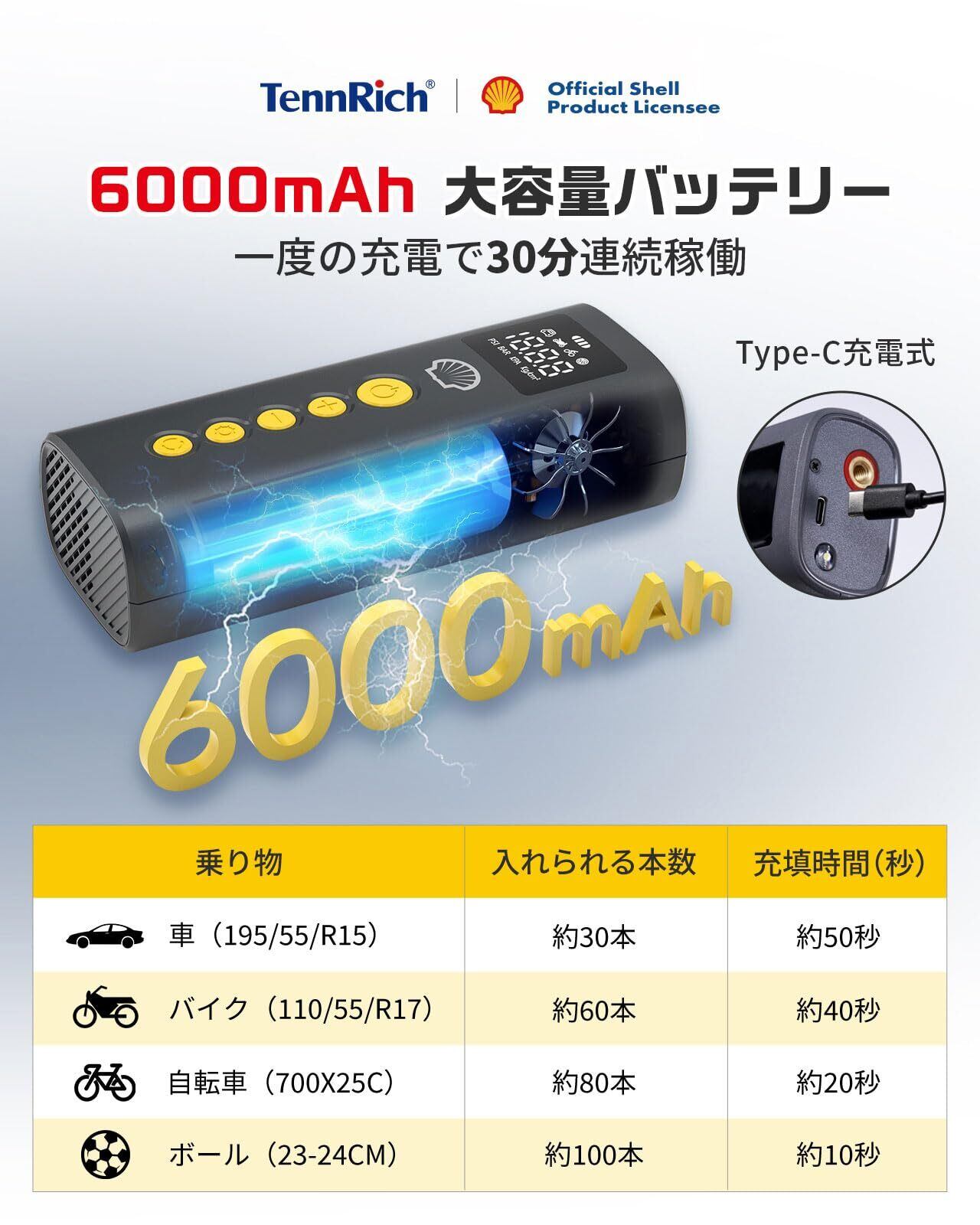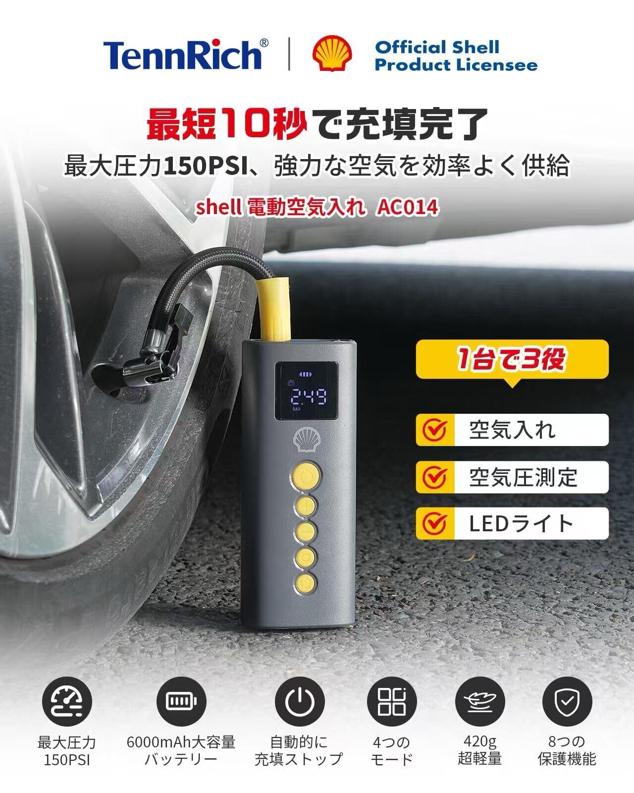 Shell シェル 電動空気入れ 6000mAh 大容量バッテリー 最大圧力150PSI 自転車 空気入れ バイク 車 用 エアコンプレッサー 小型 Type-C 充電式 コードレス 自動停止 低騒音 仏/英/米式バルブ対応 SOS/LED懐中ライト付き エアポンプ モバイルコンプレッサー AC014