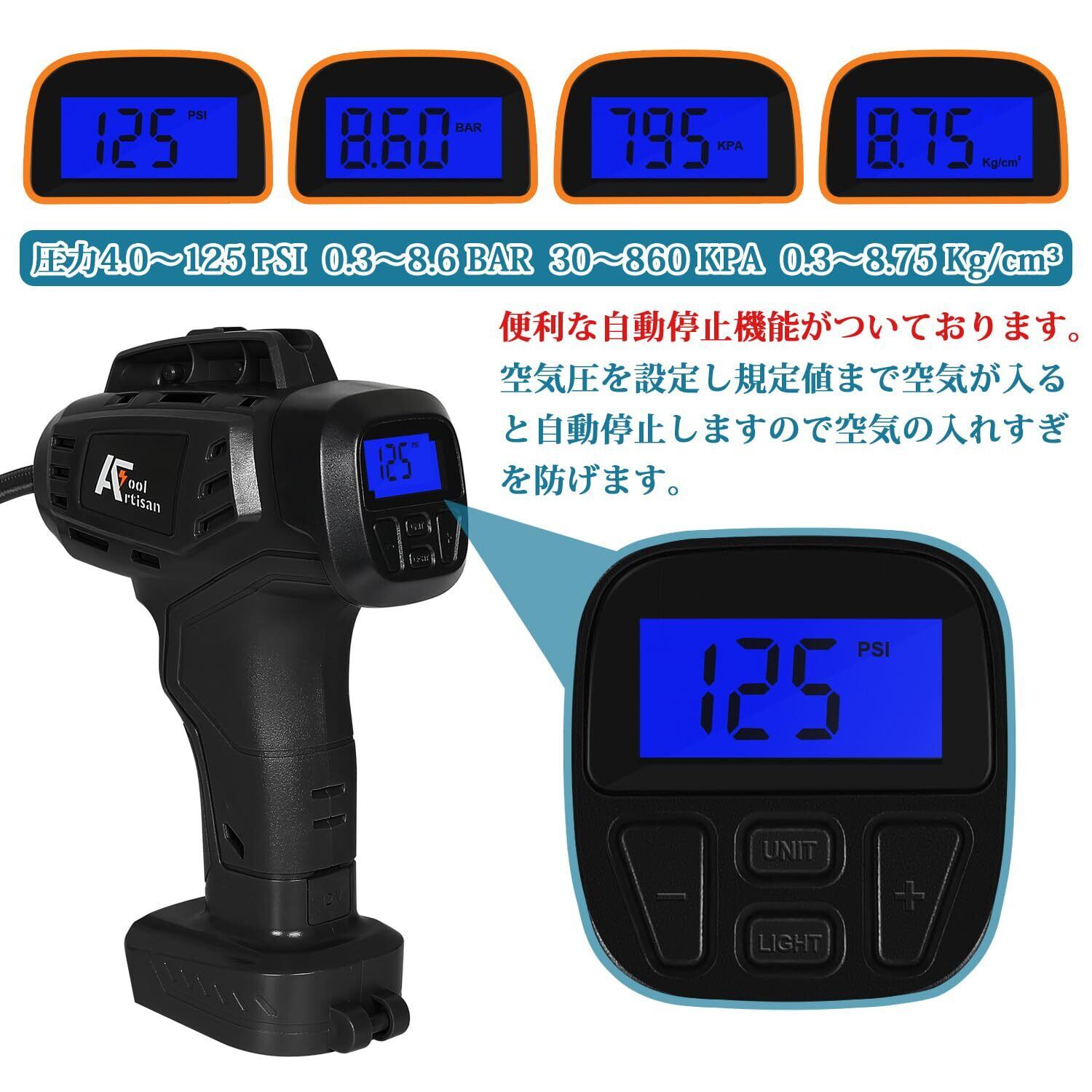 2WAY給電:シガー電源ケーブルと18Vバッテリー(バッテリー別売)※シガー電源からの充電はできません LEDスクリーンで圧力を設定し、設定値に達すると自動的に停止する機能があり過充填を防ぎます。さらに、PSI、BAR、KPA、kg/cm²の4つの圧力単位を選択できます。