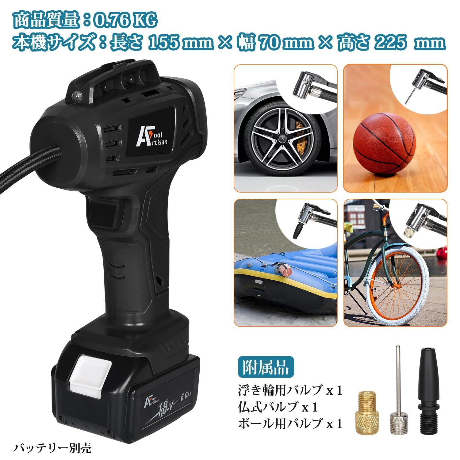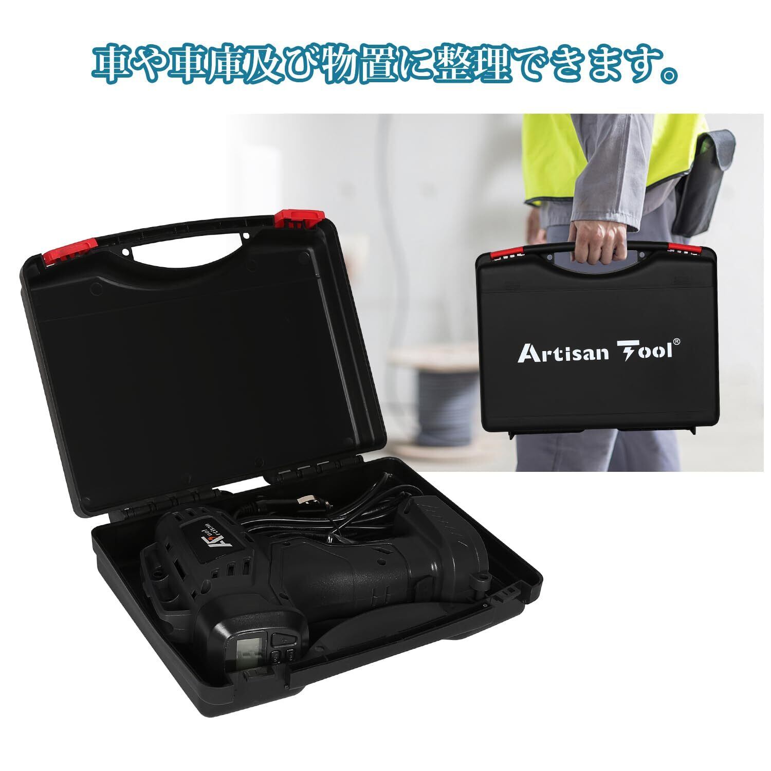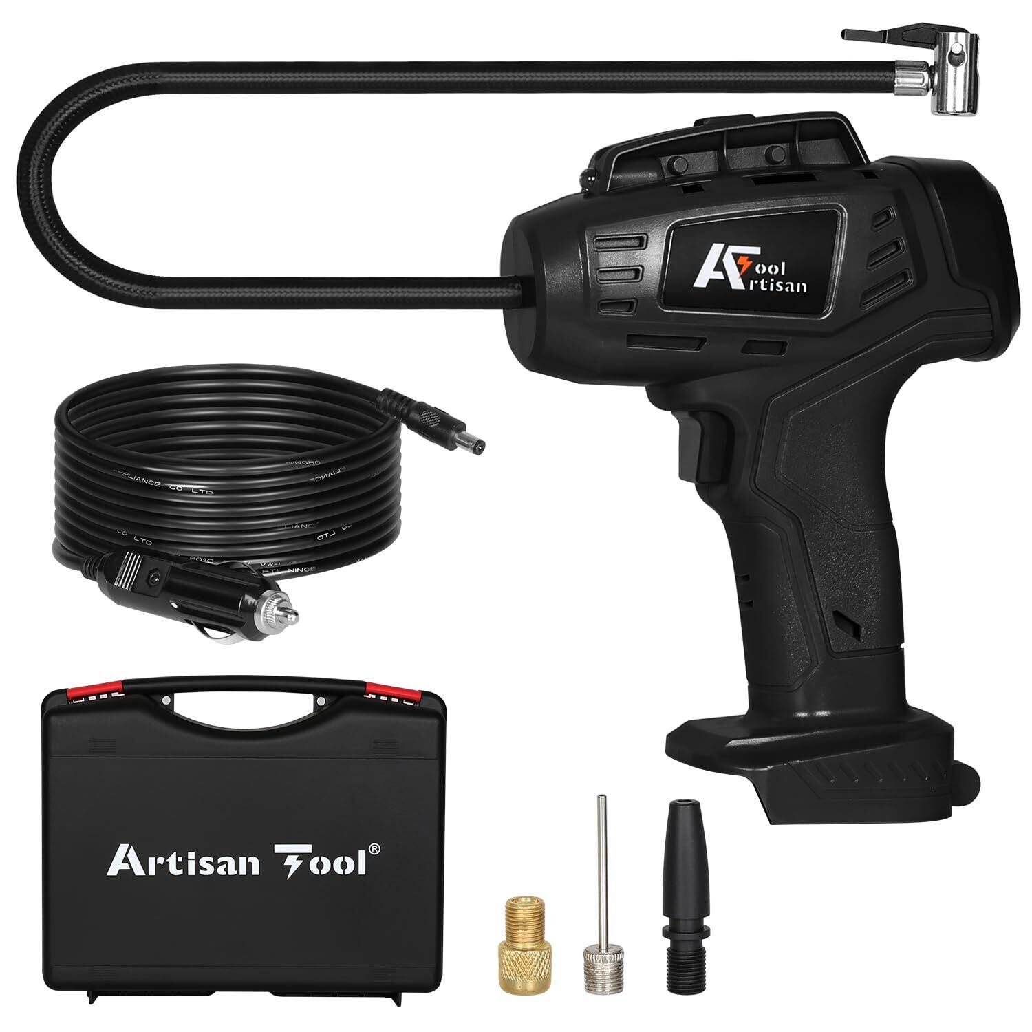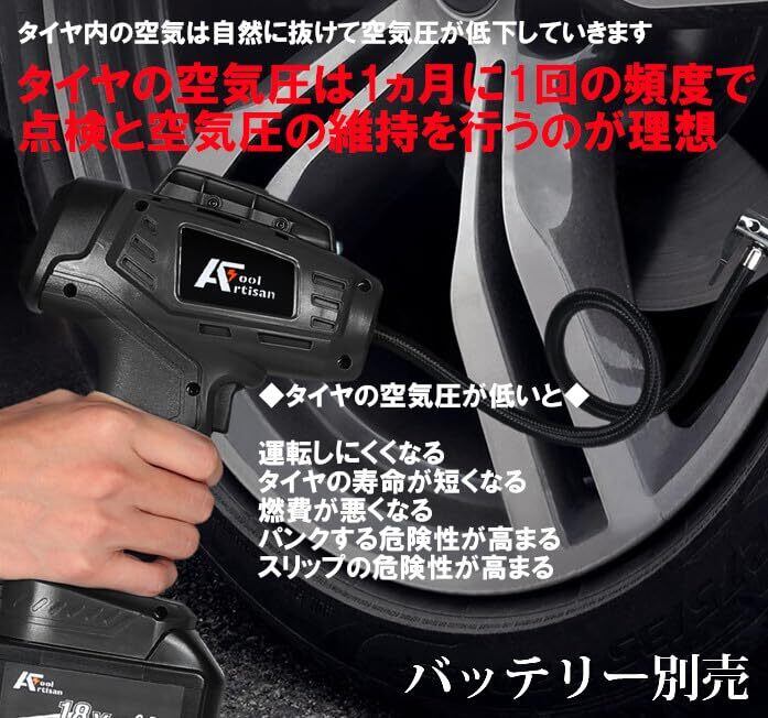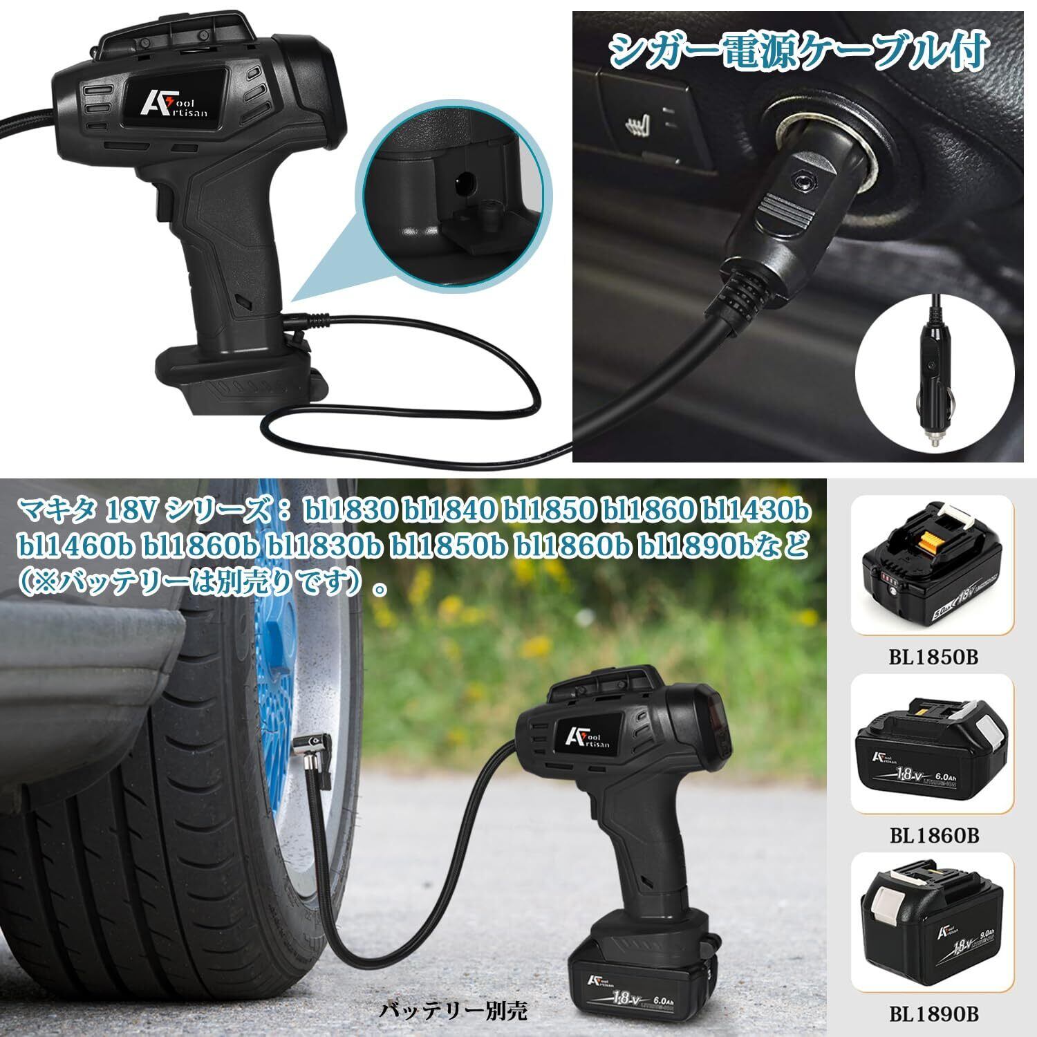 アルチザンツール 充電式エアコンプレッサー (黒色) オートストップ機能 AT-AP01bK 車のタイヤ 電動空気入れ 自転車のタイヤ、ボール、小さな浮き輪の空気入れ 2WAY給電:シガー電源(ケーブル付)と18Vバッテリー(バッテリー別売)マキタ互換品