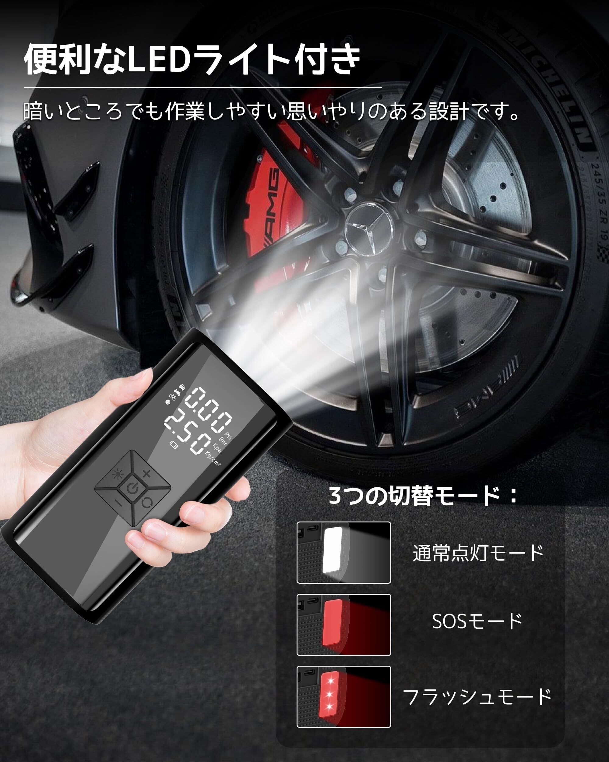 【電動空気入れ・LEDライト付き&持ち運び便利】暗いところでも作業しやすい思いやりのある設計です。3つの切替モード:通常点灯モード(応急照明)、SOSモード(注意喚起)、 フラッシュモード(非常時警告)。サイズ:15.8*5.6*7.9cm。小型軽量デザインなので、女性でも手軽に使えます。収納袋は付属して、収納がしやすくなります。