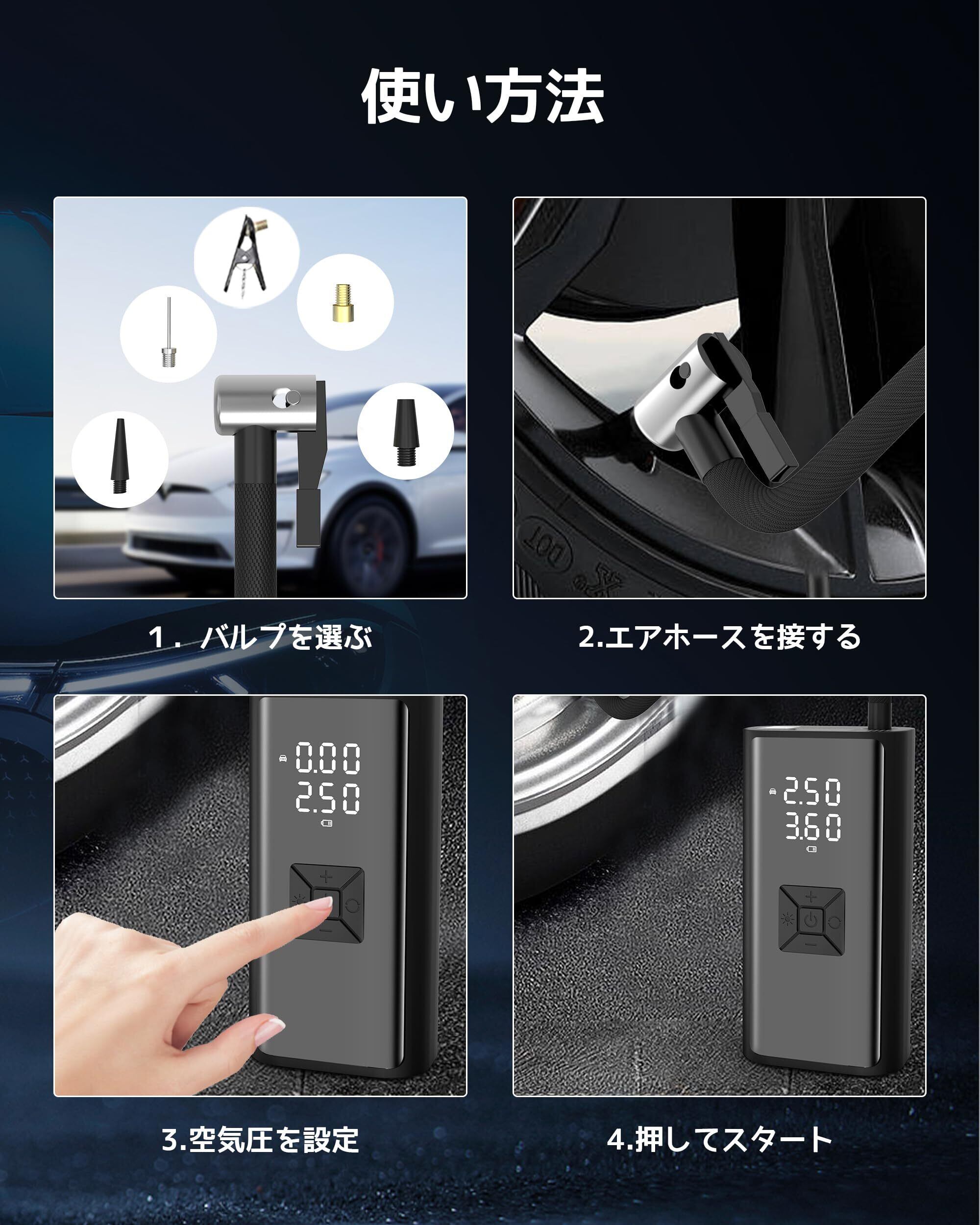 【電動空気入れ・6000mAh大容量電池付き!】 大容量6000mahリチウム電池を内蔵しており、一度充電して長時間動作可能です。フル充電で、バイクのタイヤを24回、自動車のタイヤを12回、普通のボールを60回空気を入れることができます。自動停止機能 搭載、スイッチを入れて作動せず、1分後に自動電源OFFになります。過熱保護機能も付き、10 分連続使用後、自動的に電源OFFになります。