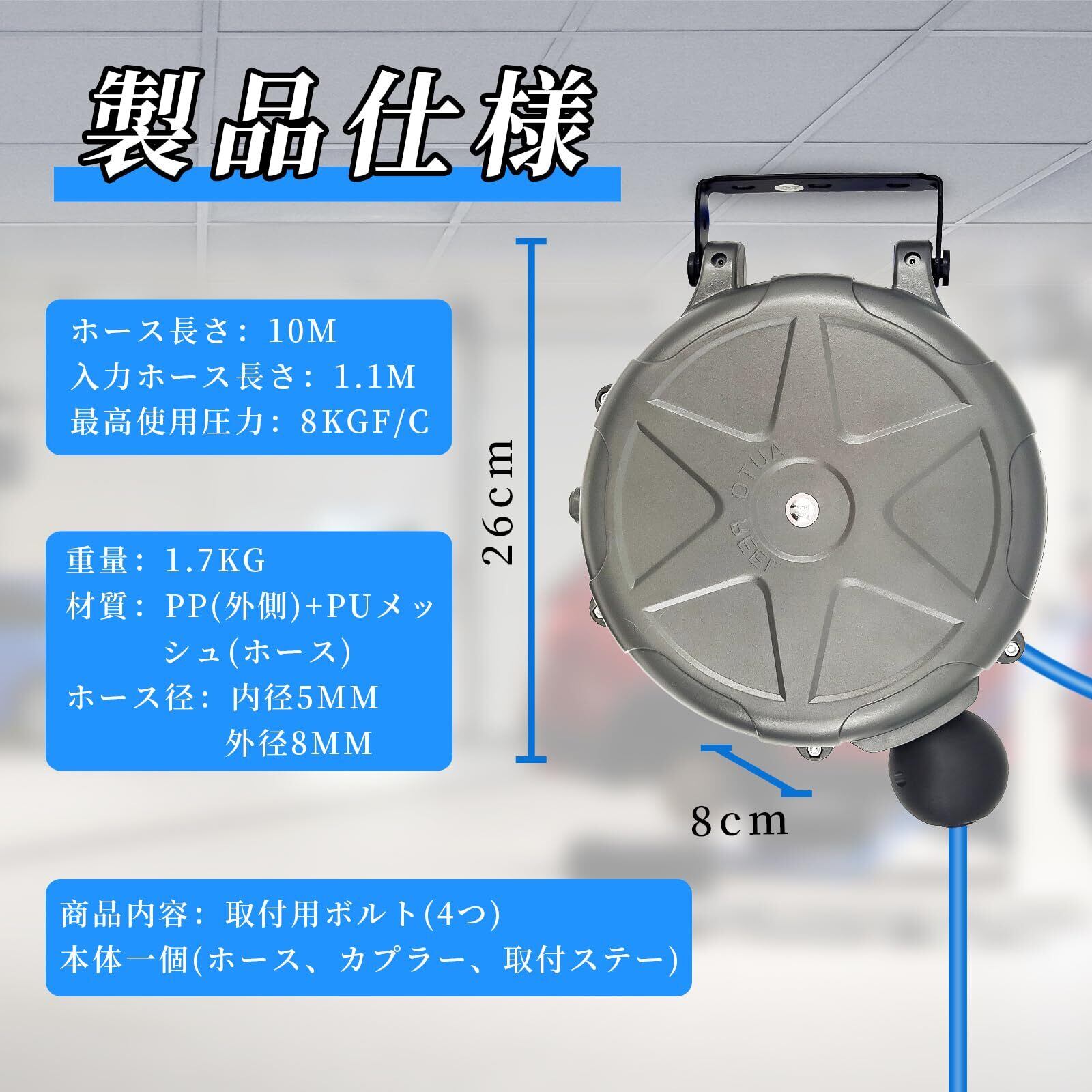 エアホースリール 10m 自動巻取式 自動巻き上げ ブラケット付 天吊り式 壁掛け 180°回転可能 エアホース外径φ8mm×内径5mm オート引き込み式 空気圧工具