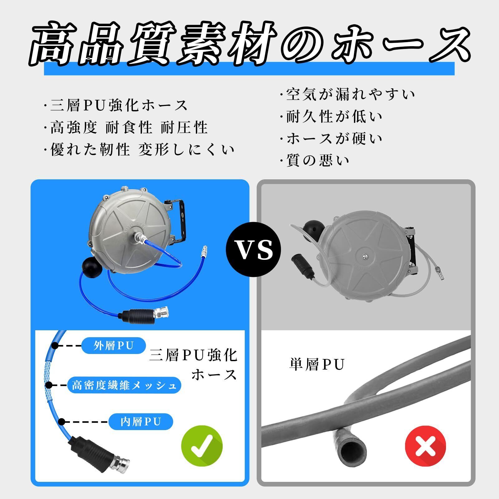 【幅広い用途】エアコンプレッサー、エアネイルガン、エア集塵機、エアドリル、エアグラインダーなどの各種空圧工具に接続可能です。自動車修理工場、洗車場、工場、家庭菜園などでご使用いただけます。 10メートルのエアホースリールはコンパクトで持ち運びに便利です。