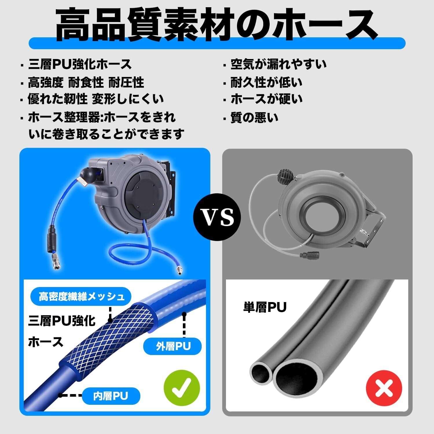 【幅広い作業に対応】このエアホースリールは、エアーコンプレッサーと接続し、ネイルガンやダスター、ドリルなどに幅広く使用可能。DIYや工場、車整備など多彩なシーンで頼れるホースリール12Mです。