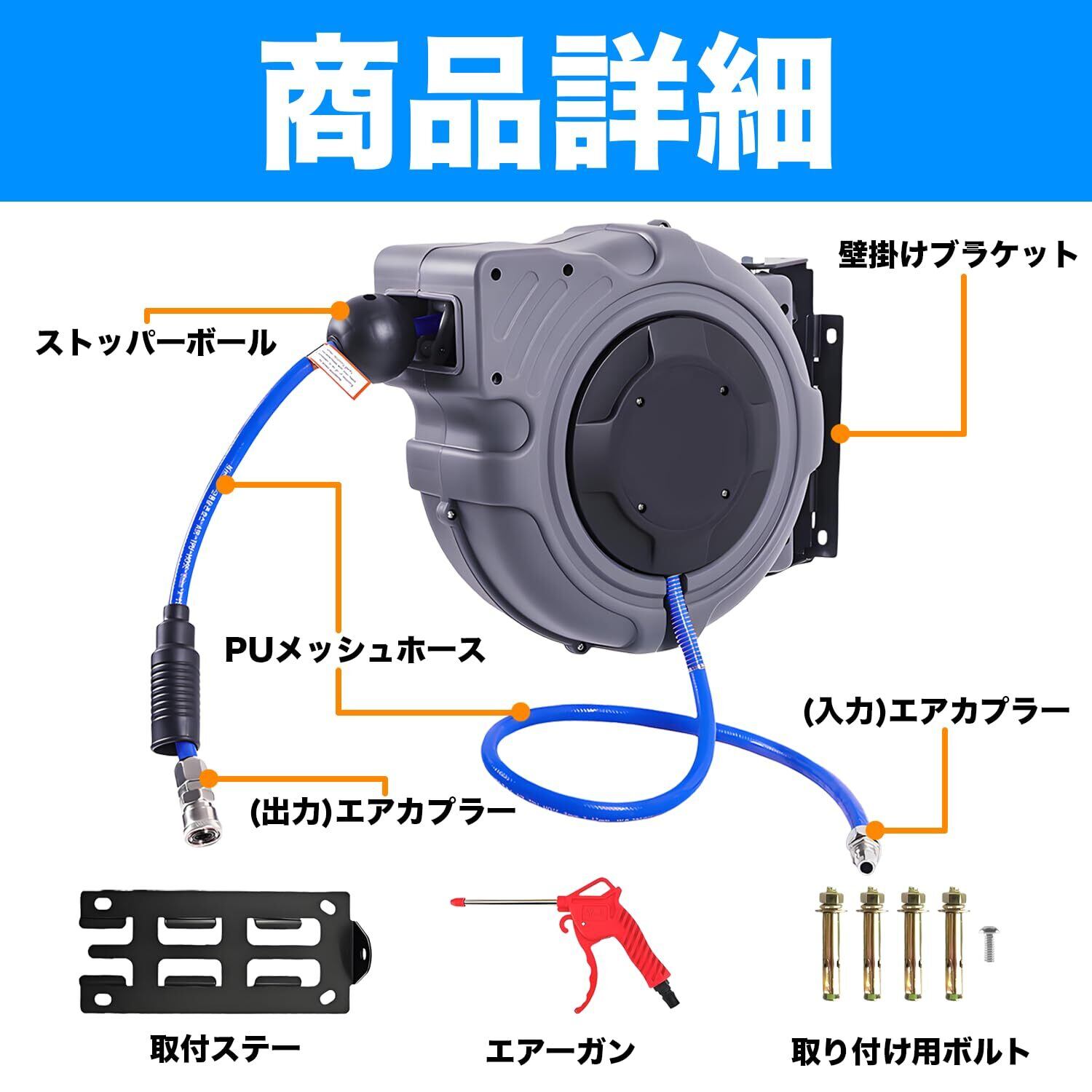 【特別価格】エアーホースリール 12m 180°回転 壁掛け 天吊可能 ホースリール12M 伸縮式スプリング 自動巻き取り エアホース 外径φ12mm 内径8mm ネイルガン エアーダスター エアードリル ブラケット付 空気圧工具 DIY 車整備