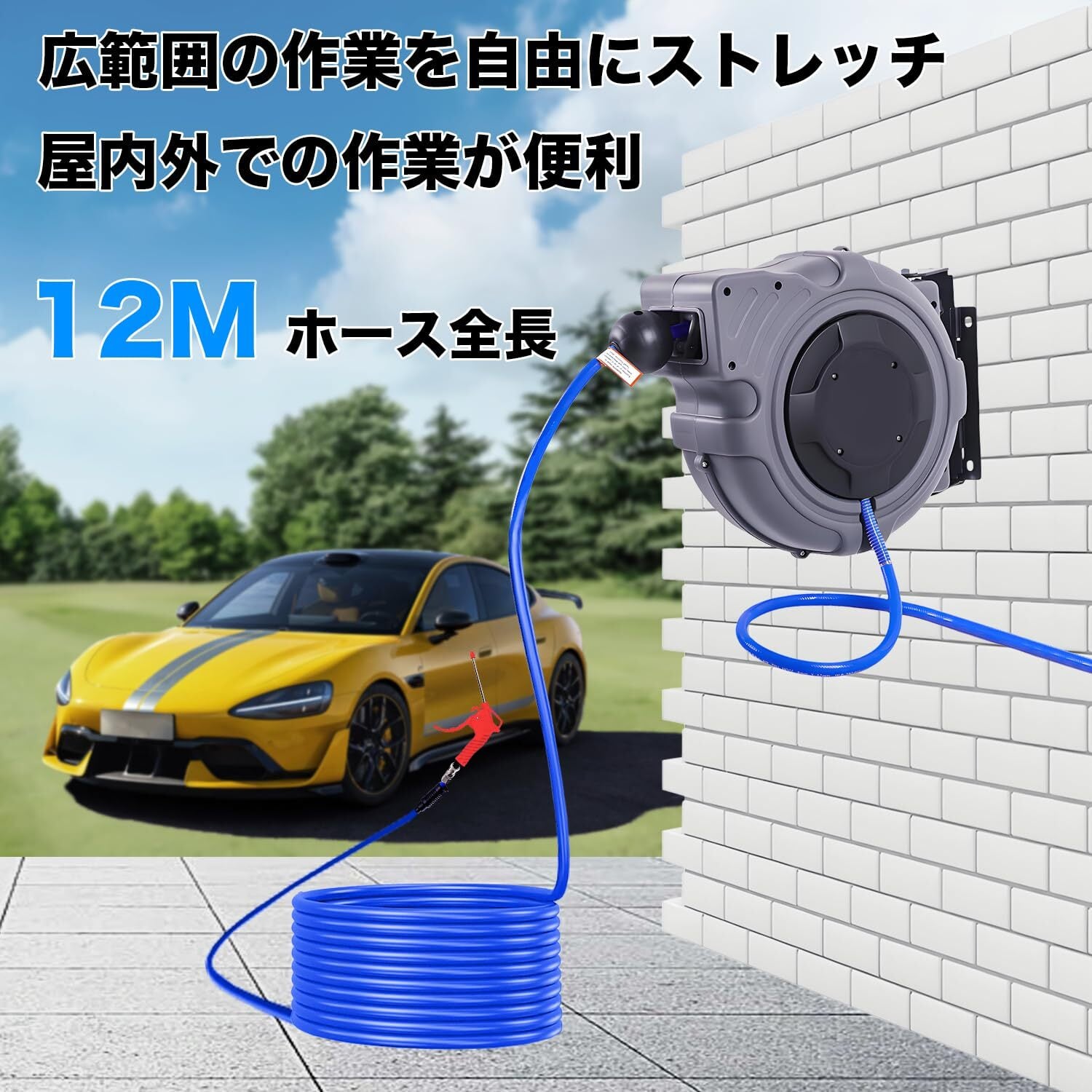 エアーホースリール 12m 180°回転 壁掛け 天吊可能 ホースリール12M 伸縮式スプリング 自動巻き取り エアホース 外径φ12mm 内径8mm ネイルガン エアーダスター エアードリル ブラケット付 空気圧工具 DIY 車整備