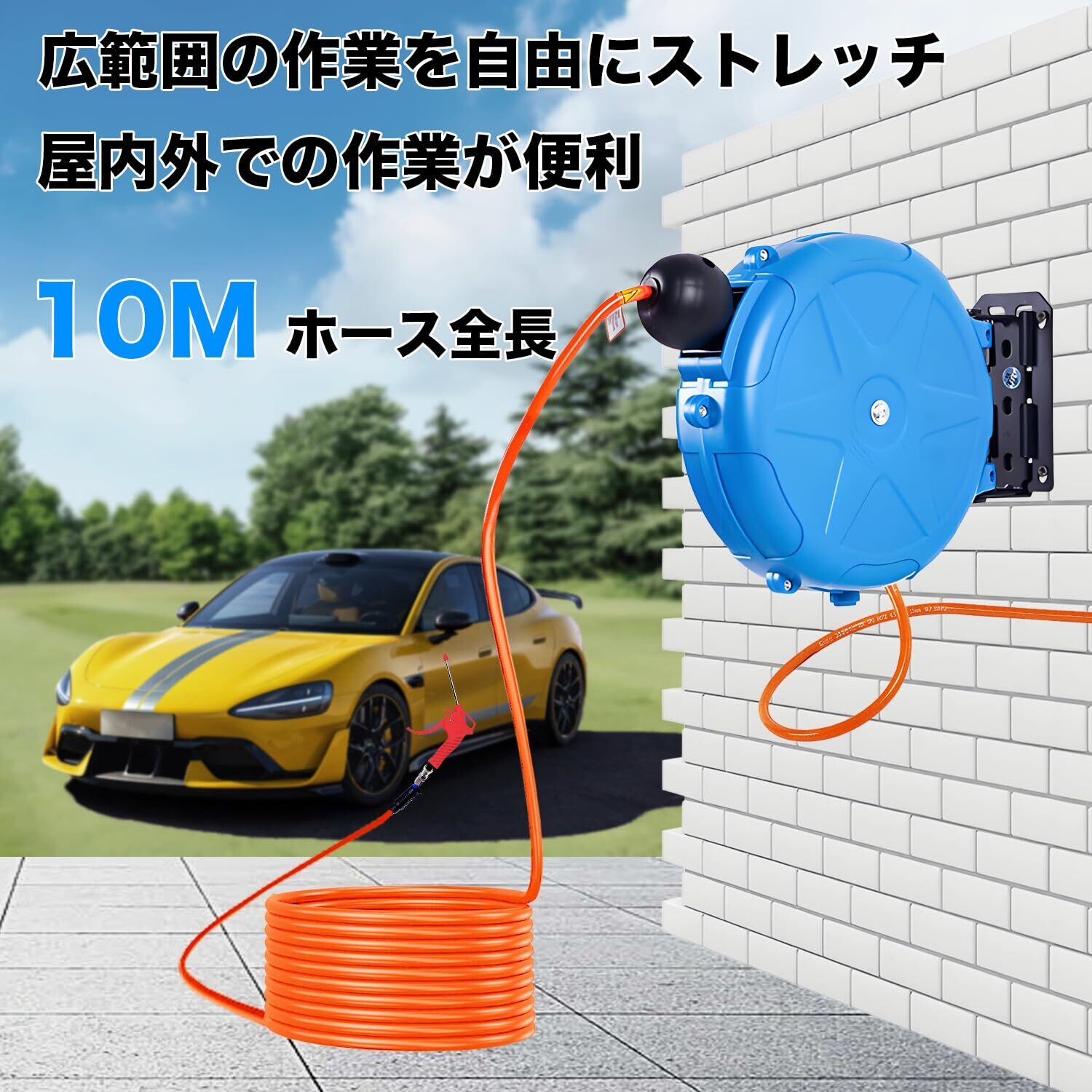 【10mのロングサイズ】ホース長さは10mで、DIYや工場作業、車整備など幅広い用途に十分対応可能。コンパクトながら作業範囲を最大化できます。