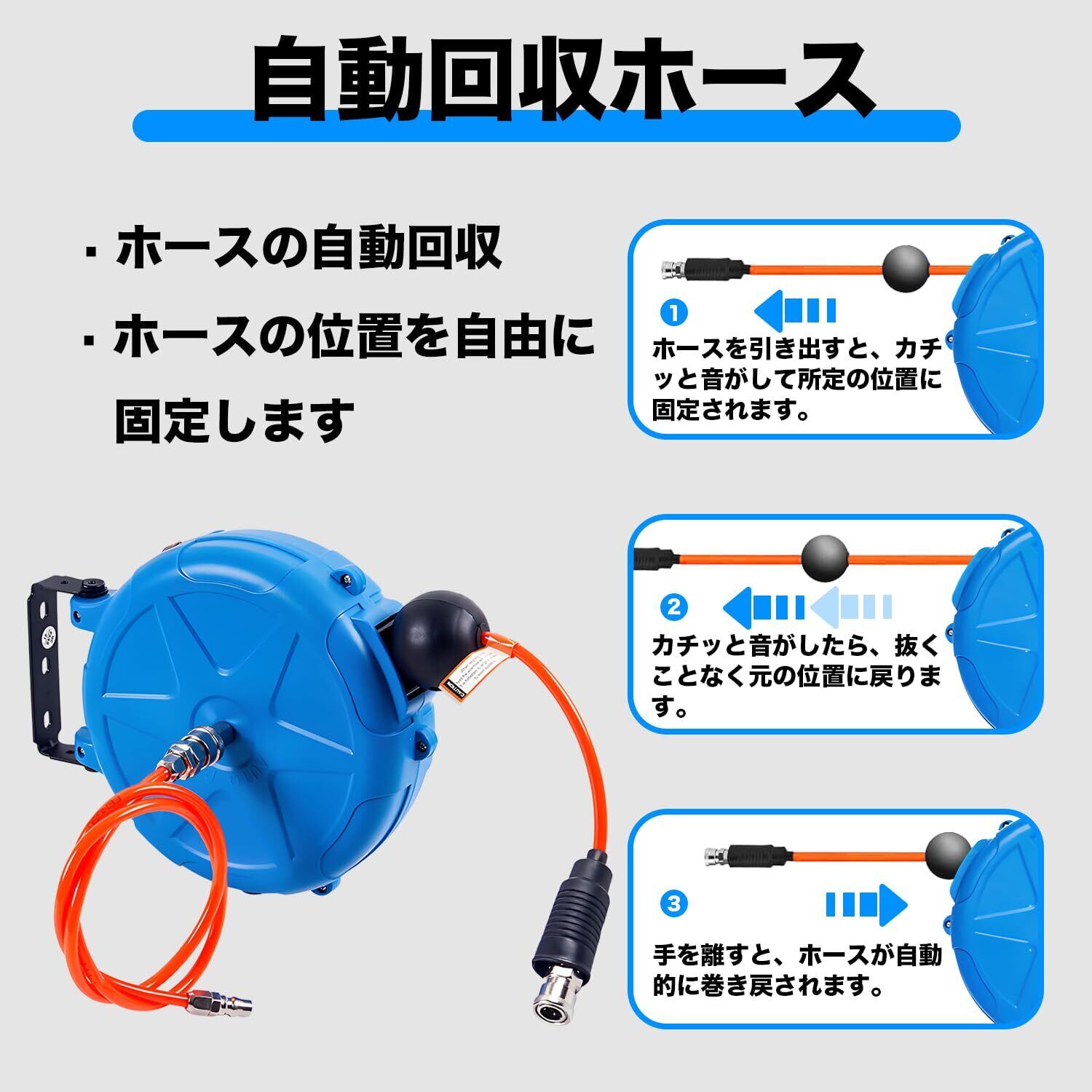 エアーホースリール 10m 壁掛け 180°回転 天吊可能 ホースリール 伸縮式スプリング 自動巻き取り エアホース 外径φ8mm 内径5mm エアーダスター ネイルガン エアードリル ブラケット付 空気圧工具 DIY 車整備