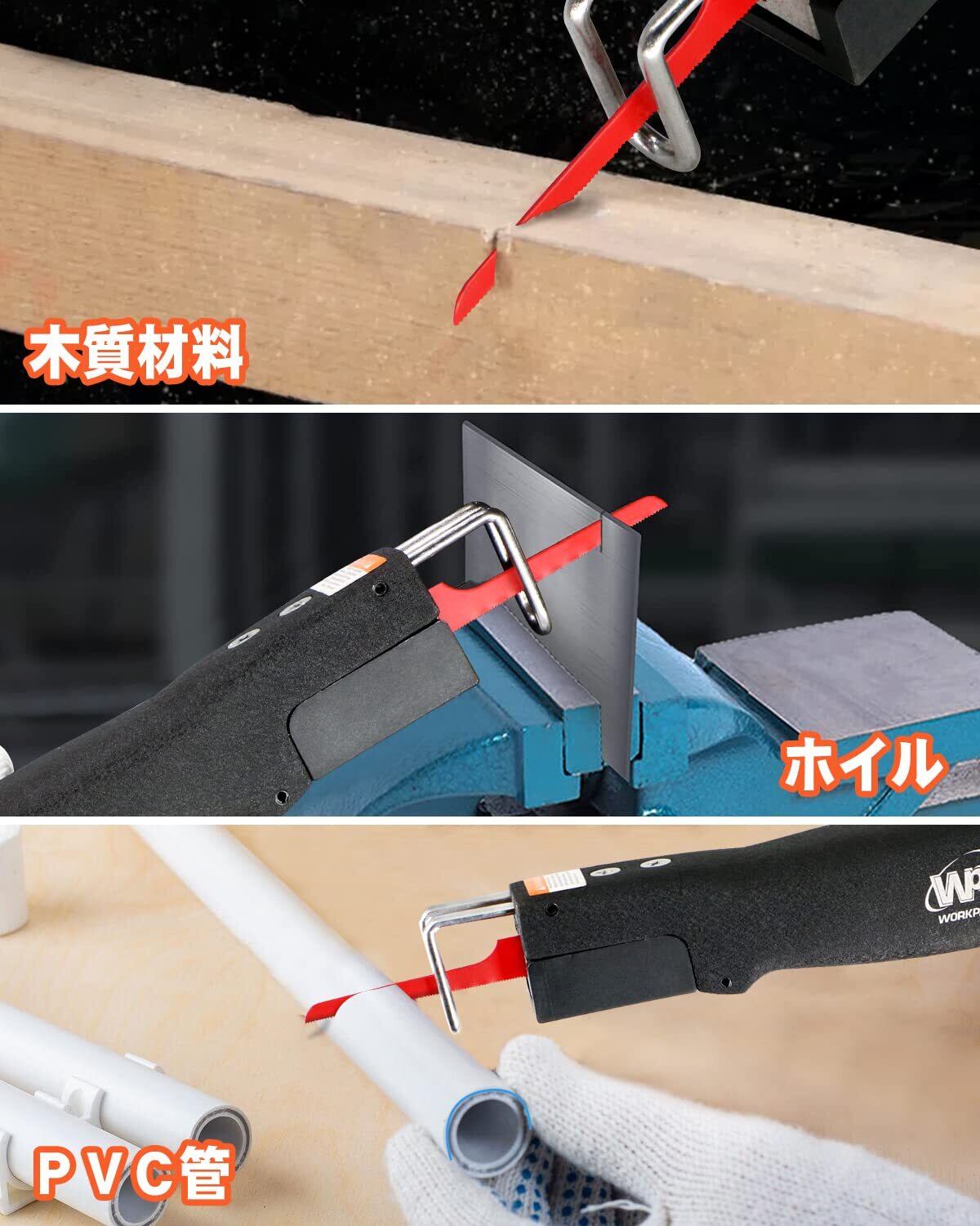 【耐久性】9000回/分の回転数で、木板、プラスチックなどの切断・加工、自動車整備・鈑金などの切断作業に便利です。また、アルミとプラスチックに対応した24山鋸刃と、スチール向けの32山鋸刃が10枚付属しているため、使用頻度がハードな使用環境にも負けない耐久性を備えています。