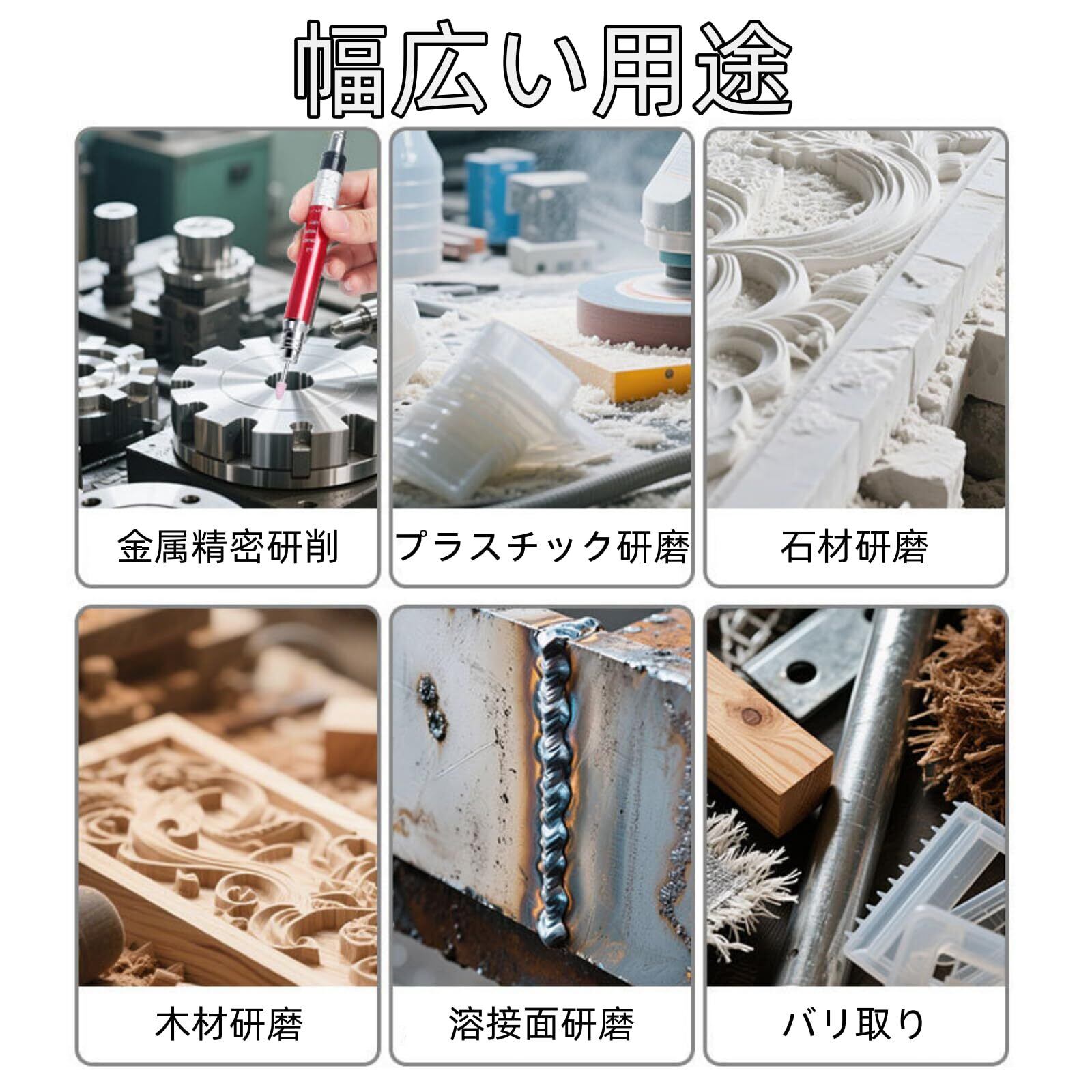 【幅広い用途】このエアーリューターは、さまざまな金属のクリーニング、面取り、研削、彫刻、内面加工に適しています。 さらに、プラスチック、石、木および他の材料の切断、サンディングおよび研磨にも使用できます。 従って、それは鉄プロダクト、木製の処理、タイヤ工業および造船業の外的な処理で広く利用されている。
