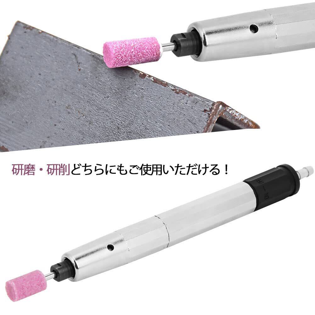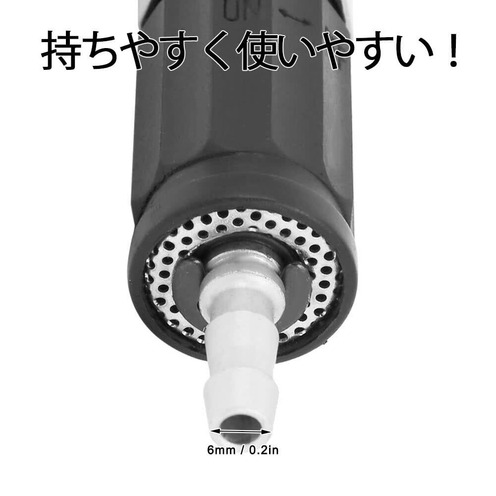 【低騒音】空気式彫刻ペンには、動作音を低減するサイレンサーエアチューブが組み込まれています。 この機能により、騒音を気にせずに静かな環境で作業できるようになります。 さらに、ハンドルはストレートなデザインで非常に持ちやすく、使いやすいです。 当社の空気圧研削ペンはシンプルなデザインなので、使いやすく、使いこなすのが簡単です。