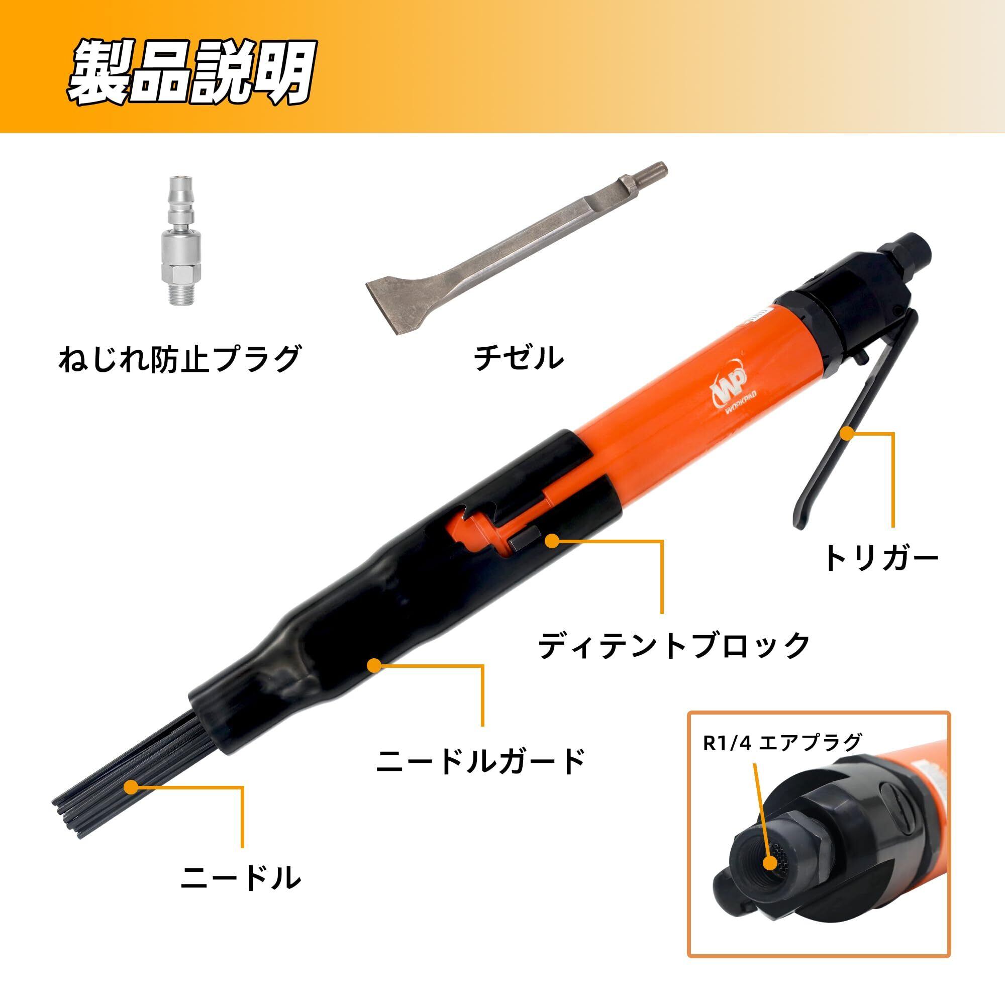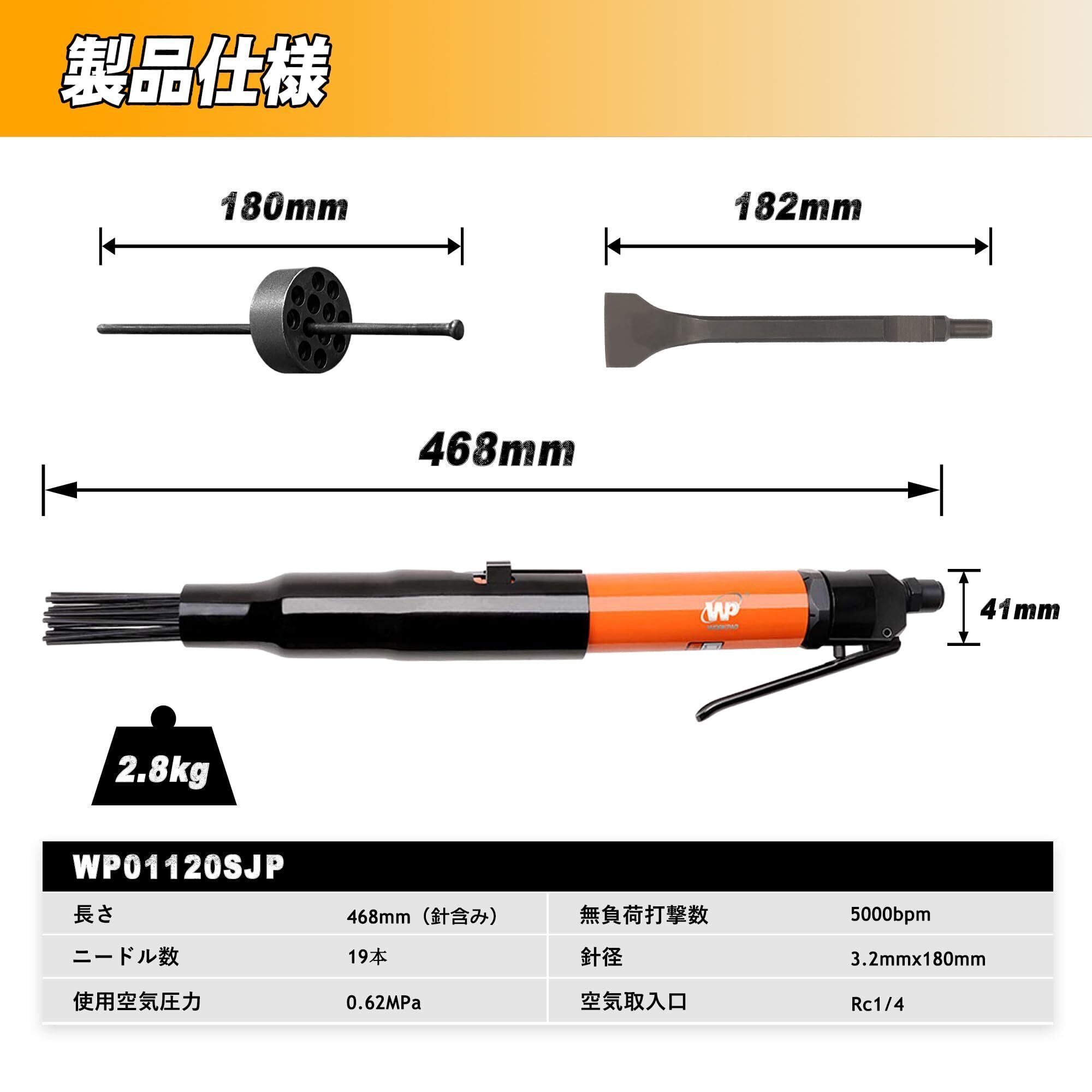 【新着商品】ジェットタガネ ニードルスケーラー プロ向け 針19本付き チゼル付き エアーハンマー兼両用 サビ落とし 塗装落とし はくり タイルはがし WP エアーツール WP01120S