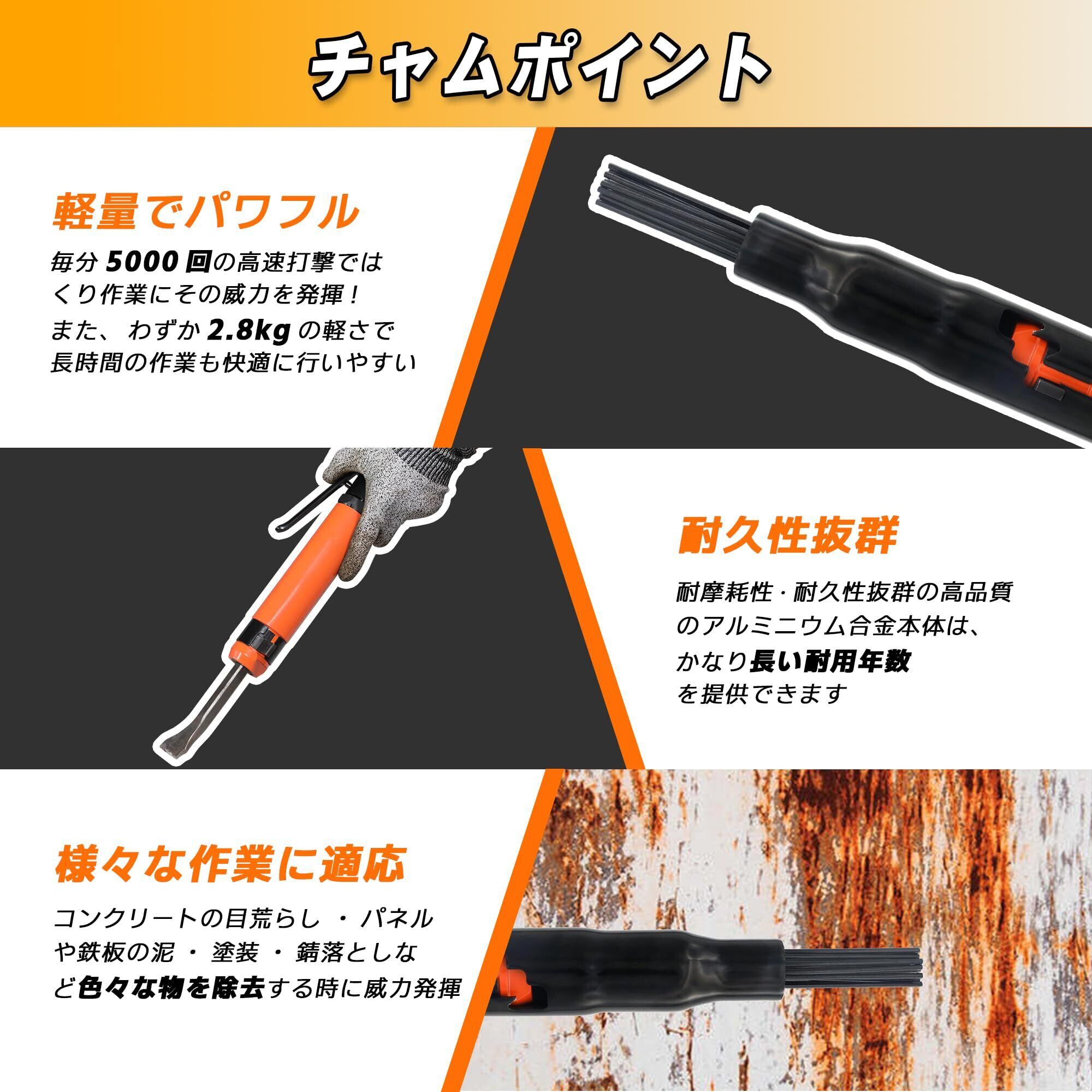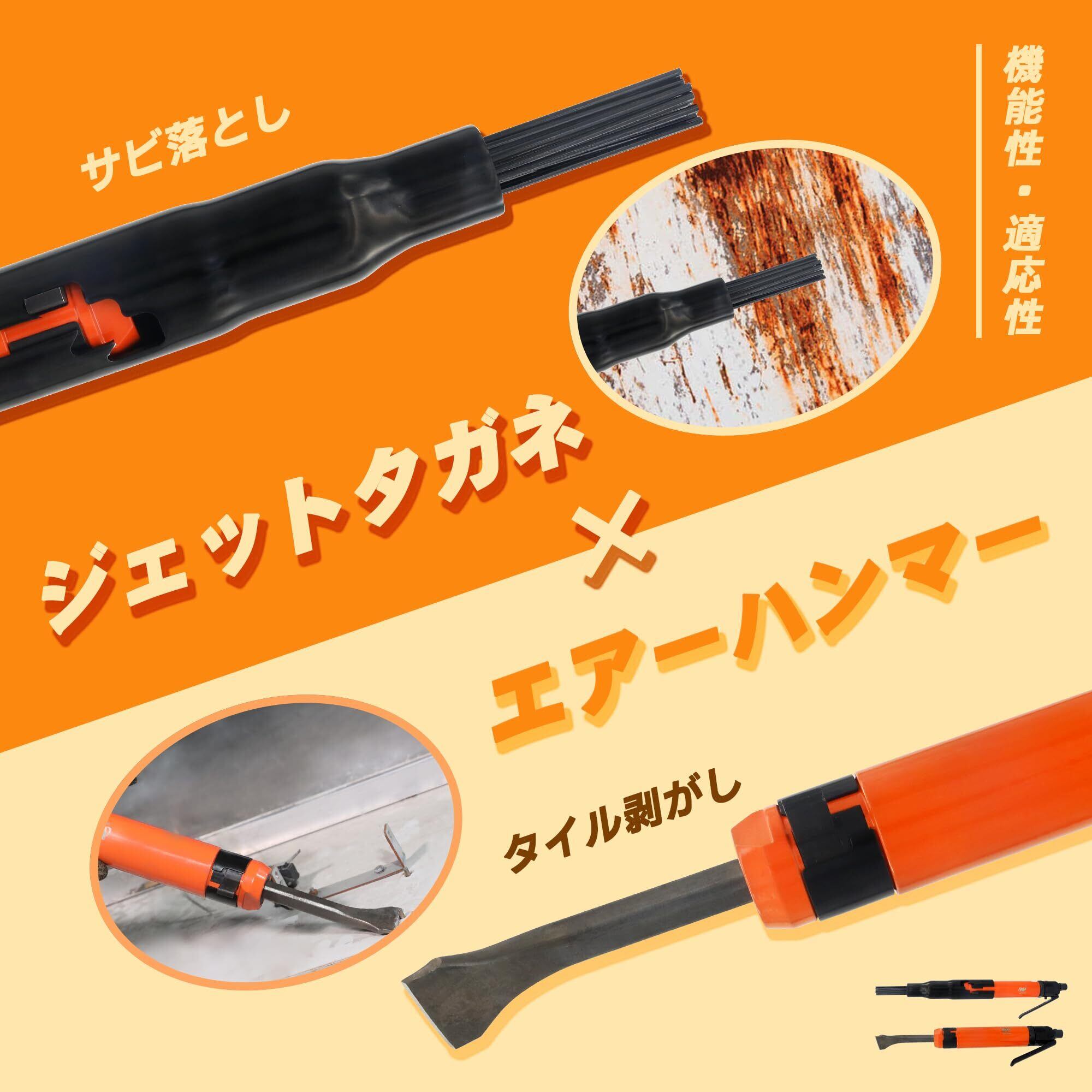 【用途】溶接後のスラグ落とし ・鋳物の砂落とし ・コンクリートの目荒らしなど、または建設機械等のしつこい泥落とし ・パネルや鉄板の泥、塗装、錆落としなど色々な物を除去する時に威力を発揮します。※ニードルを外すと、ジェットタガネとエアーハンマー兼用できます。