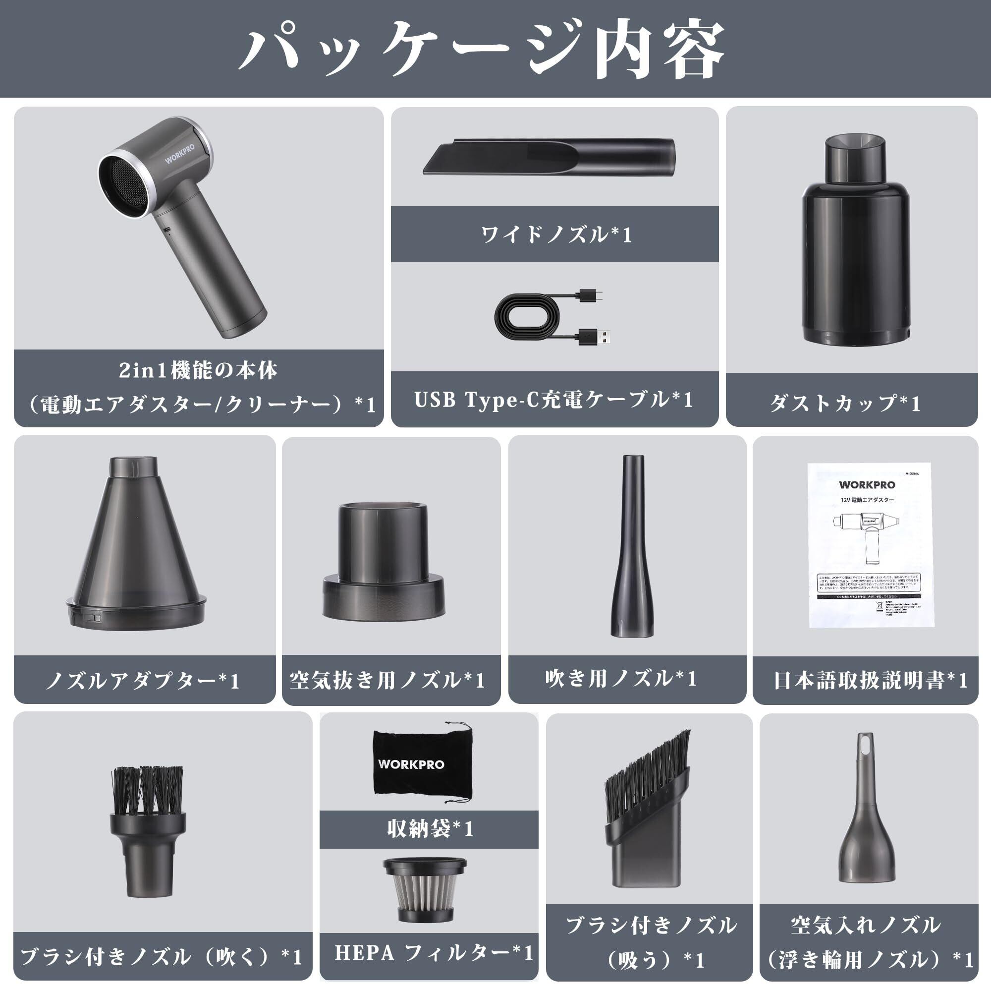 WORKPRO 電動エアダスター ブロワー 1 2in1 吹き飛ばし&吸い込む 小型 車載掃除機 ハンディクリーナー 4 段階風力調整 吸引力 6500PA Type-C 充電式 軽量 コードレス 風量表示ランプ付き 充電表示ランプ付き PC 掃除 キーボード 車内 エアコン 洗車用 家具掃除 日本語取扱説明書付き