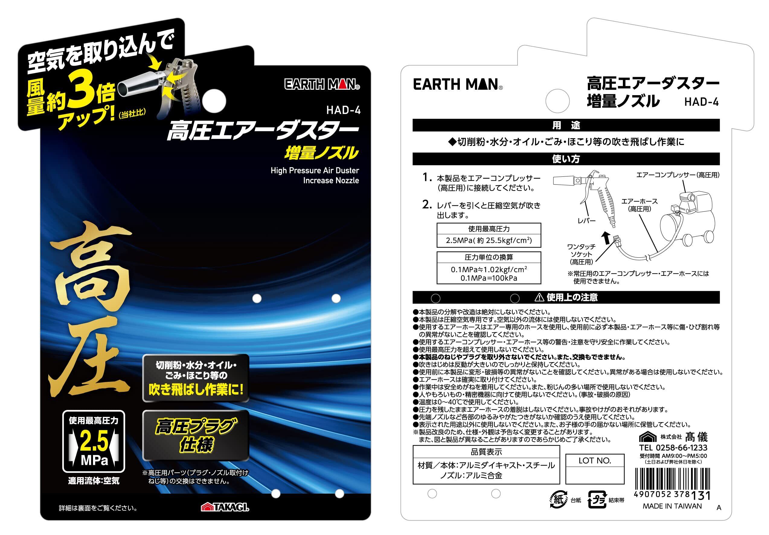 高儀(Takagi) EARTH MAN 高圧エアーダスター 増量ノズル 使用最高圧力2.5Mpa 空気を取り込んで 風量約3倍アップ(当社比) 切削粉·水分·オイル·ごみ·ほこり等の吹き飛ばし作業に 高圧プラグ仕様 HAD-4