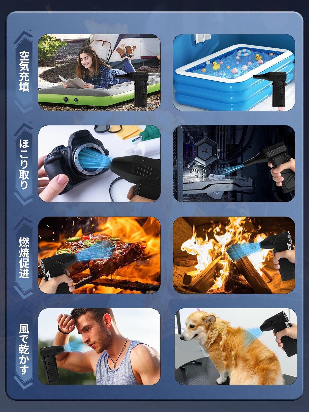 【様々なシーン対応、高効率清潔】キーボードの清潔、電子デバイスのほこり除去、車のインテリアメンテナンスに関わらず、ジェットファンは簡単に対処できます。コードレス設計により、室内でも室外でも高効率で便利な清潔体験を楽しむことができます。52m/sの風速と無段差風量調整機能により、デバイスは各種の清潔ニーズに適応でき、細かい電子デバイスの清潔から強力な車のインテリア吹き出しまで、優れた性能を提供します。
