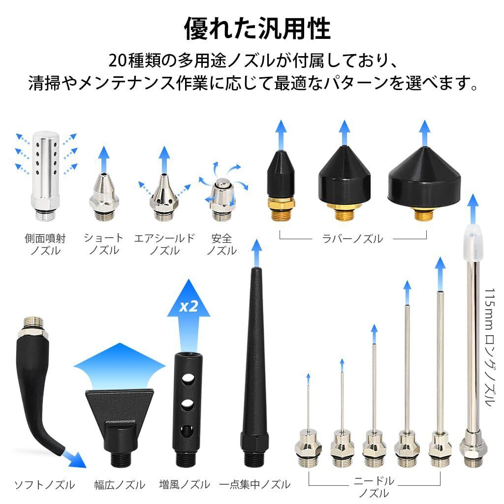 【優れた汎用性】20種類の多用途ノズルが付属しており、清掃やメンテナンス作業に応じて最適なパターンを選べます。2種類のアダプターも付属し、別売りノズルにも対応可能。