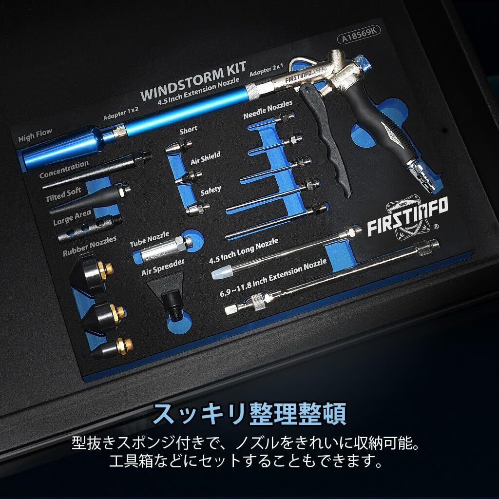 【商品内容】エアブローガン、高流量ノズル、側面噴射ノズル、ショートノズル、エアシールドノズル、安全ノズル、ラバーノズル*3、ソフトノズル、幅広ノズル、増風ノズル、一点集中ノズル、ニードルノズル*5、115mmロングノズル、175~300mm延長ノズル、115mm延長ノズル、1/8-1/4変換アダプター、1/4-1/8変換アダプター