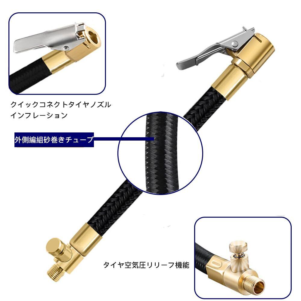 【簡単なインストール】①雄ネジをエアポンプの空気出口に接続します。②クイック接続エアチャックをタイヤのバルブに接続します。