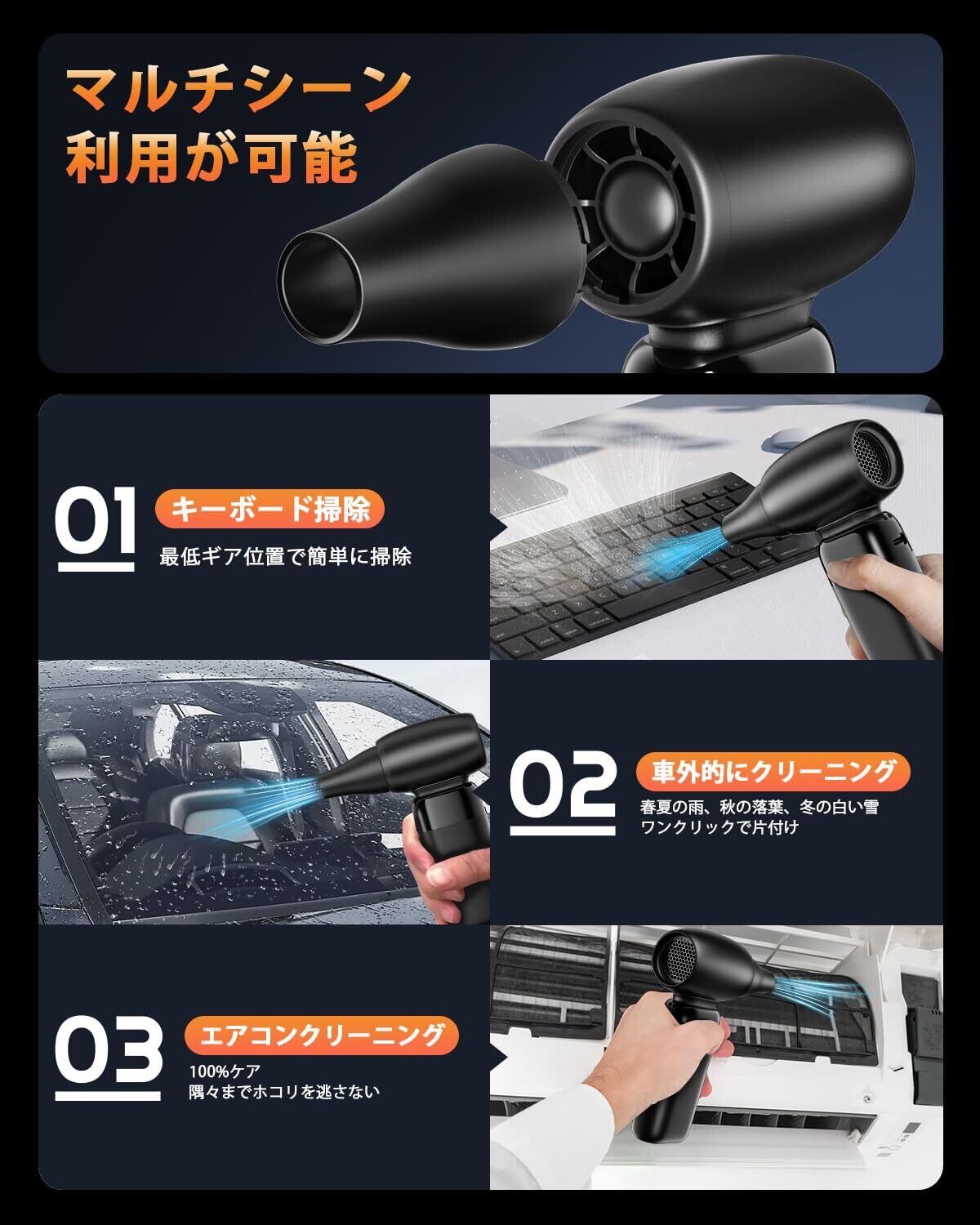 【3段階風量調整&多用途対応】長押し2秒で電源ON後、ボタンクリックで3段階の風量を即時切替。キーボード溝のパンくず、PC内部のホコリ、カメラレンズの微粒子、車内エアコン吹き出し口など、あらゆる狭小スペースに最適。強風モードでは屋外のBBQ炭起こしや洗車後の水切りにも威力を発揮します。
