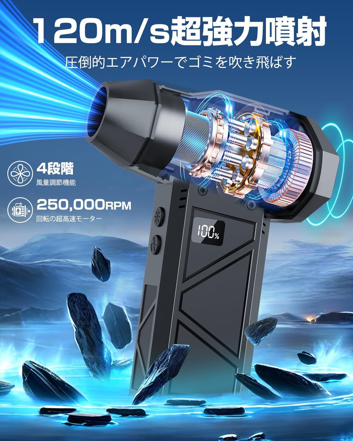 【マッハ級の風速を実現!そのパワー、まるで超音速ジェット】■圧倒的な風力の秘密はここに!①SonicBlast Turbo技術-自社開発のSonicBlast Turbo技術により、航空ターボダイナミクスを応用し、空気の圧縮と放出効率を最大化。ジェットエンジン並みのパワーと安定性を実現!②超高効率ブラシレスモーター-200000RPM回転の高効率ブラシレスモーターが最大風速101m/sを生み出し、業務用レベルの驚異的な風速を実現!③ダブルタービンファン構造-双重タービンファンが大量の空気を吸い込み、一瞬で放出。④専用タービンダクト-特別設計されたタービンダクトが圧力を最大化し、風を一点に集中!