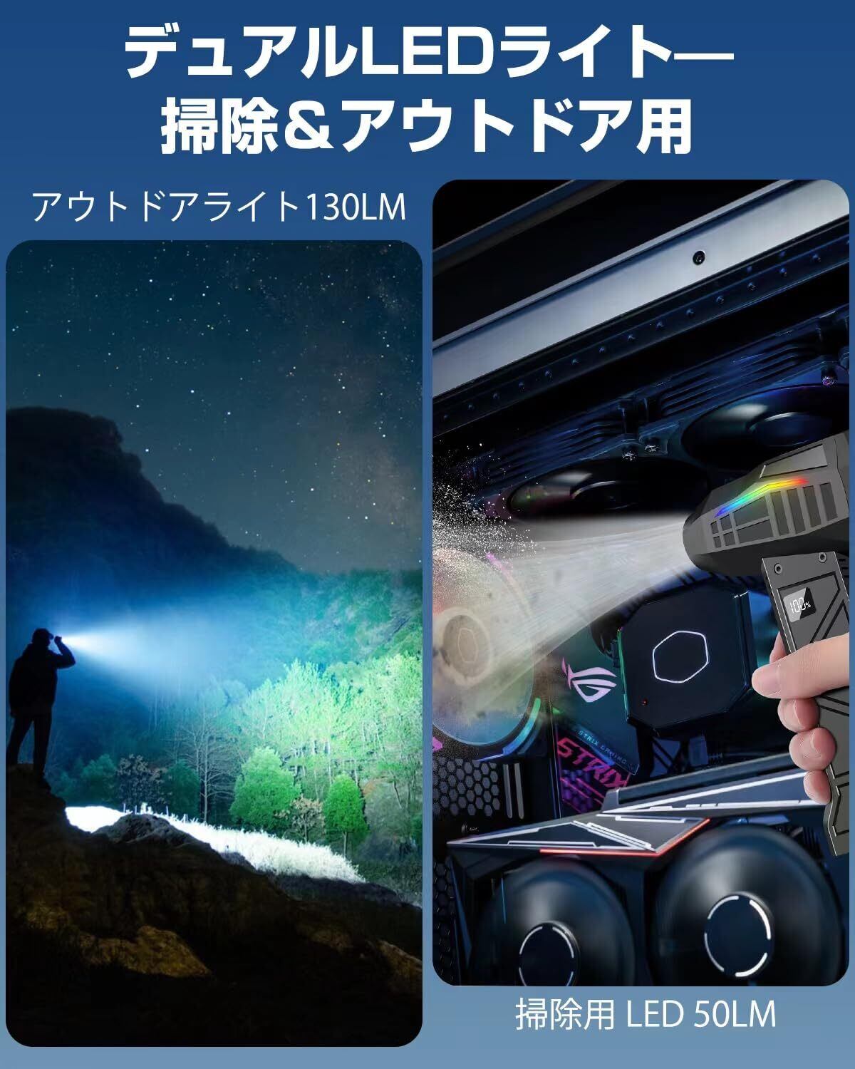 【ダブルLEDで強力照射!清掃も照明もSOSライトもこれ一台】■清掃から照明、手持ちライト・懐中電灯・防災ライトまで、まさに「これ1台で完璧!」の電動エアダスター登場!①上下に搭載したダブルLEDが驚異の明るさを放ち、通常のエアダスターとは一線を画す光量で、暗い隅々も小さな隙間もまるで昼間のように照らし出し、清掃の手間を一気に解消!②さらに、この多機能ライトは、手持ちライト・懐中電灯・防災用・キャンプ用ライトとしても使用可能。停電や緊急時にはもちろん、アウトドアでも大活躍。③その上、LEDの切り替えも超簡単。■上のLEDライトはライトボタンを長押しで点灯・消灯。■下のLEDライトはライトボタンを短押しで常灯・高速点滅(SOS)・低速点滅・消灯。