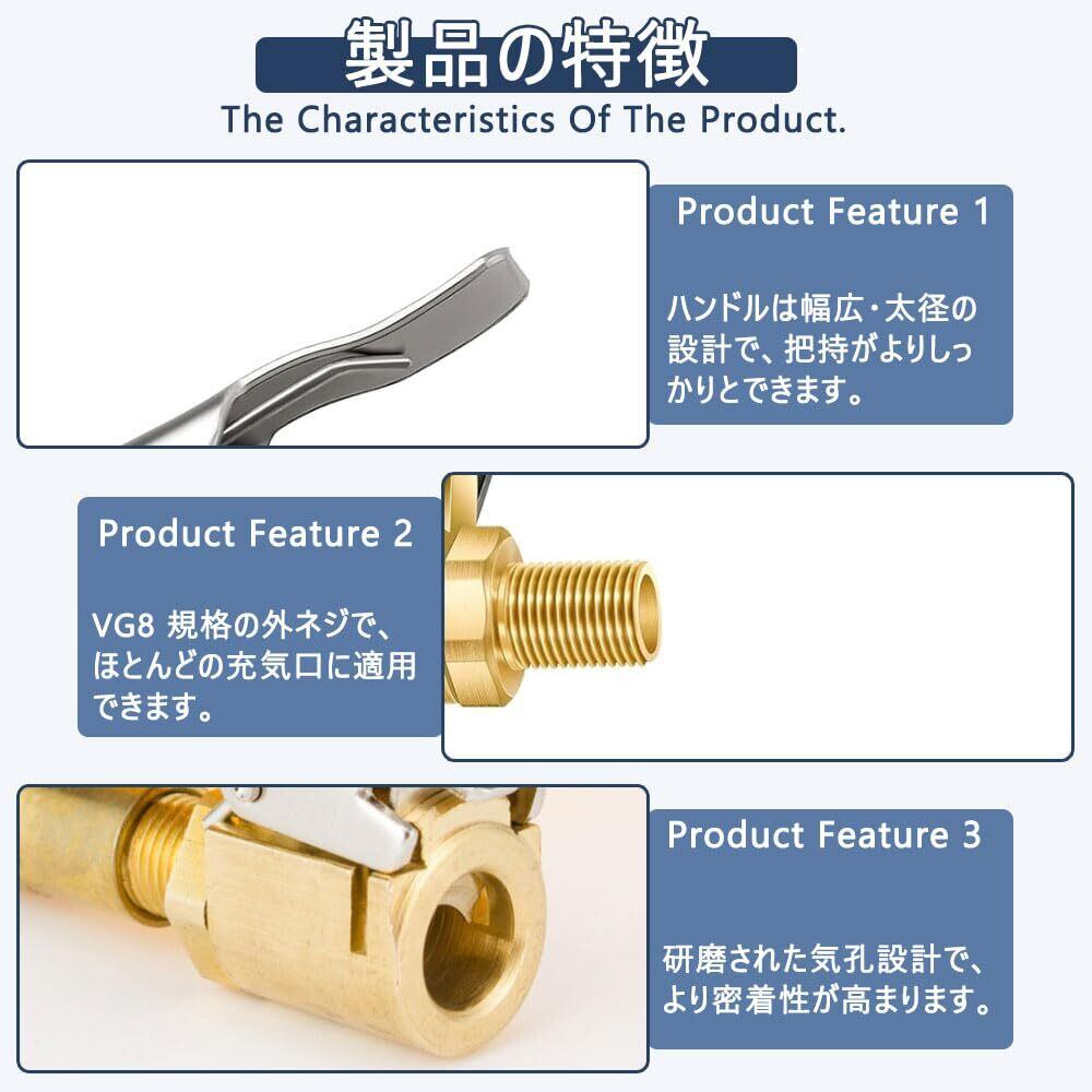 【製品の特徴】 ハンドルは幅広・太径の設計で、把持がしやすい。 VG8規格の外ネジで、ほとんどの充気口に適用できる。 研磨された気孔設計で、密着性が高い。