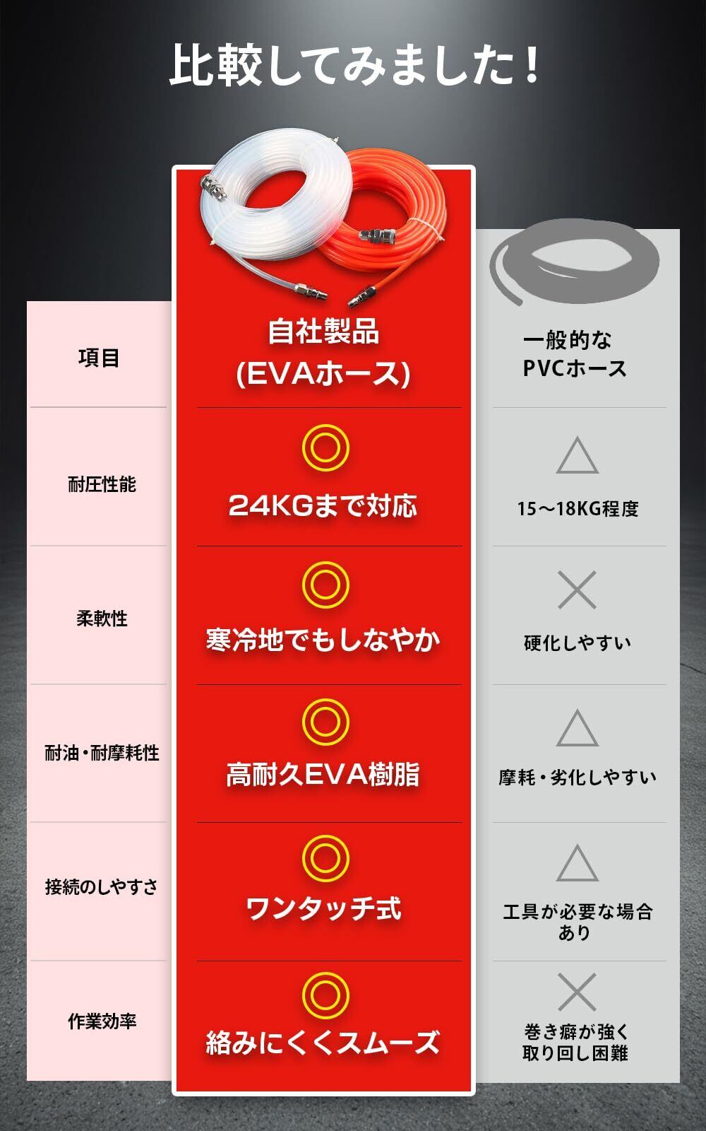 ■軟質塩化ビニールに比べ、耐圧性能が高いEVA樹脂を使用。しなやかで柔らかく、耐油性、耐摩耗性、高圧にも優れたエアーコンプレッサー用ホースです。