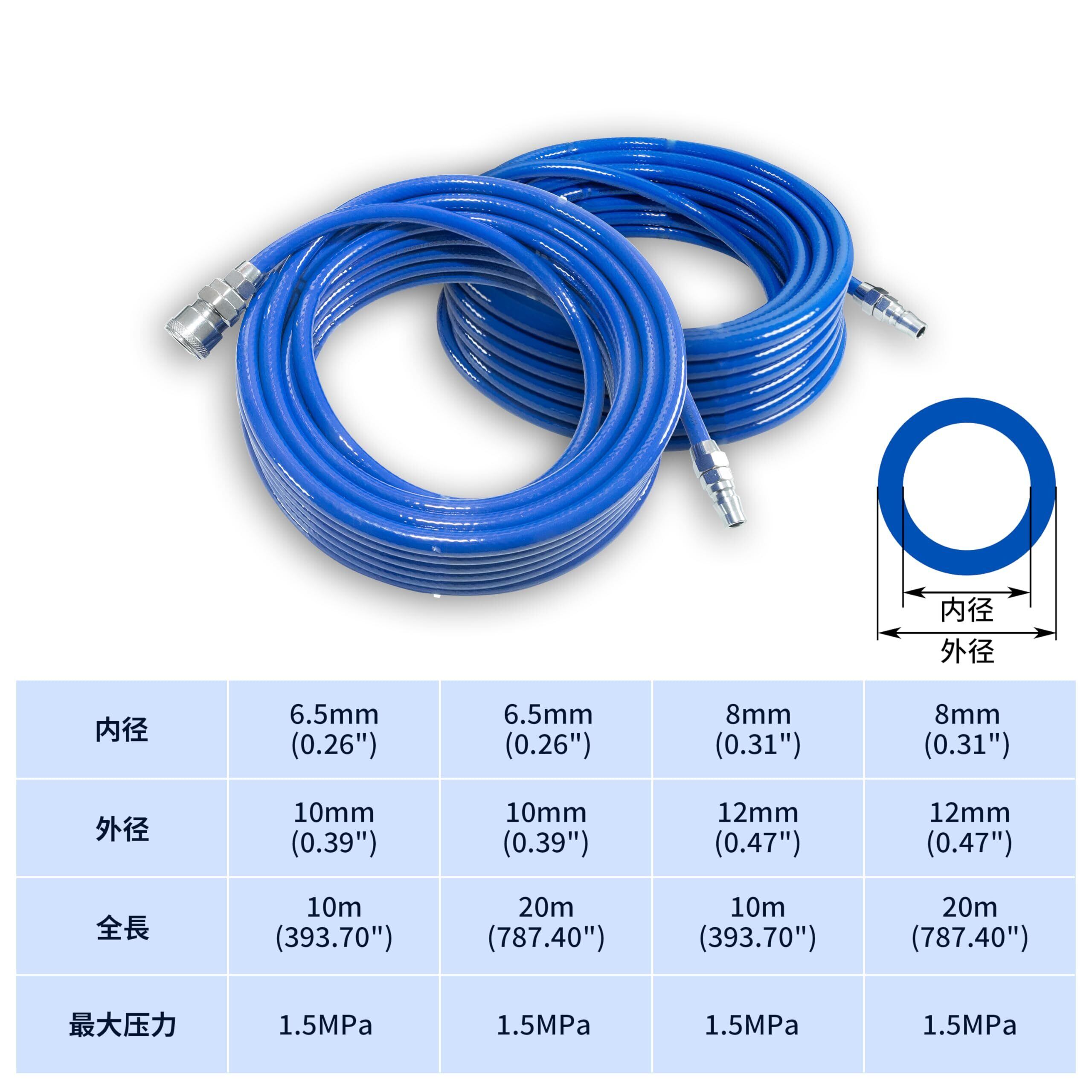サイズ:内径8mm、外径12mm、長さ20m 最高使用圧力1.5MPa。接続にはC型クイックカプラー(SP30+PP30)を使用。購入時はSTEELMIGHT公式正規品をお認めください。品質で安心してお選びいただけます。(出荷元:;販売元:STEELMIGHT)