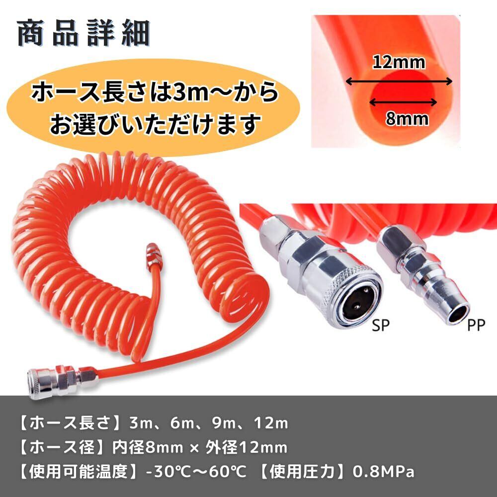 【限定セール】PLEAVIT エアーホース スパイラル 内径8mm 外径12mm 3m ワンタッチ カプラー 継ぎ手 PUウレタン 赤