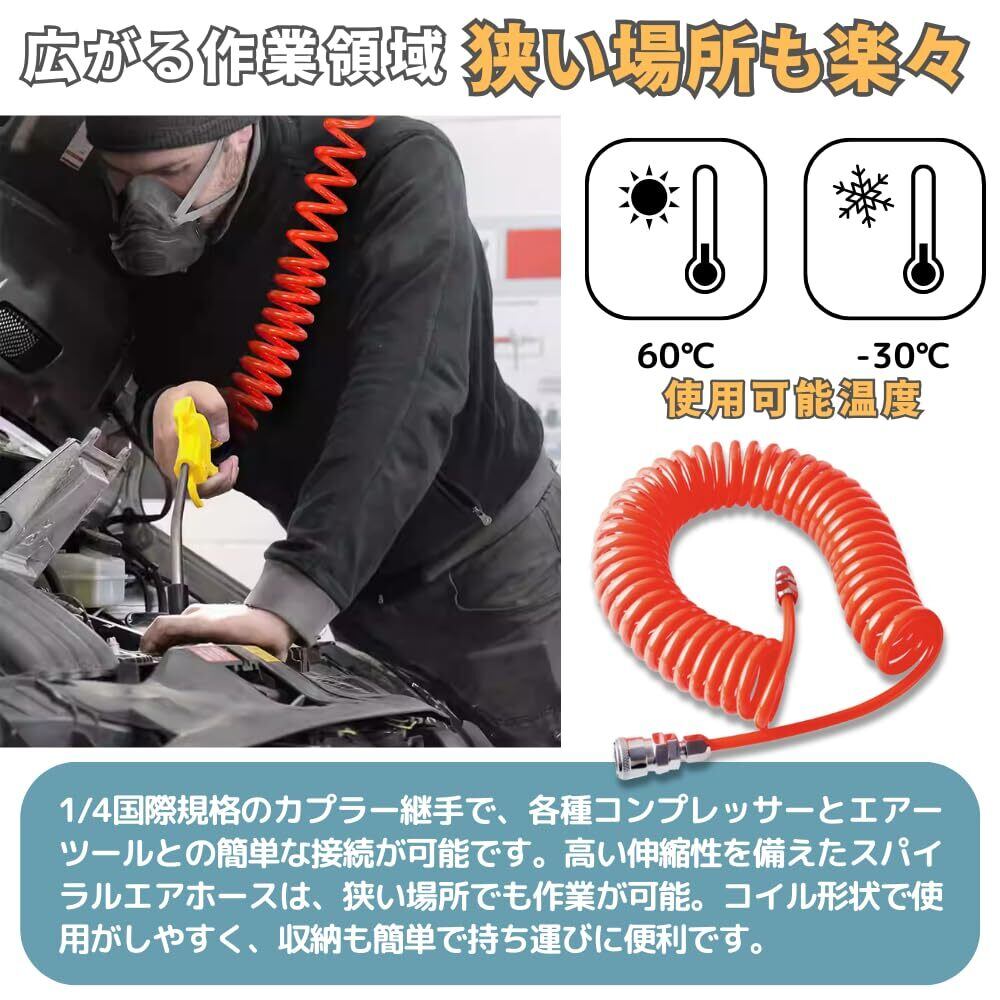 【広がる作業領域、狭い場所も楽々】1/4国際規格の継手を搭載し、各種コンプレッサーとエアーツールとの簡単な接続が可能です。高い伸縮性を備えたスパイラルエアホースは、狭い場所でも作業が可能です。コイル形状での使用がしやすく、収納も簡単で持ち運びに便利です。
