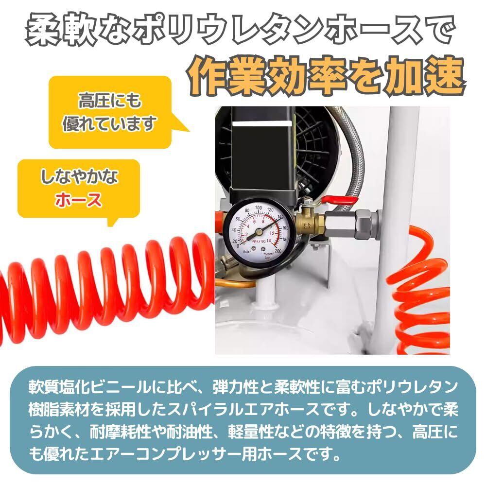 【柔軟なPUスパイラルホースで作業効率を加速】軟質塩化ビニールに比べ、弾力性と柔軟性に富むポリウレタン樹脂素材を採用したスパイラルエアホースです。しなやかで柔らかく、耐摩耗性や耐油性、軽量性などの特徴を持つ、高圧にも優れたエアーコンプレッサー用ホースです。