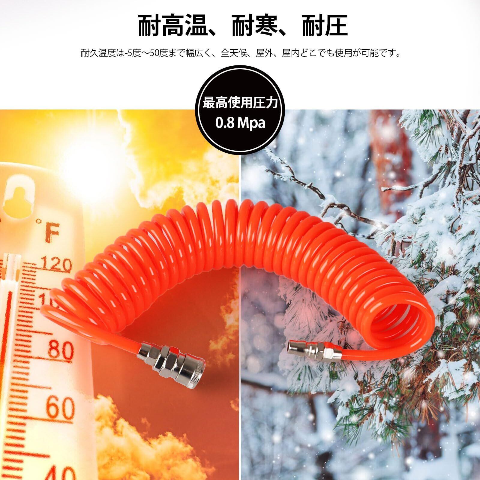 耐高温、耐寒、耐圧:エアーホースが耐久温度は-5度~50度まで幅広くて、全天候、屋外、屋内どこでも使用が可能です。約0.8 Mpaの圧力に耐えることができます。