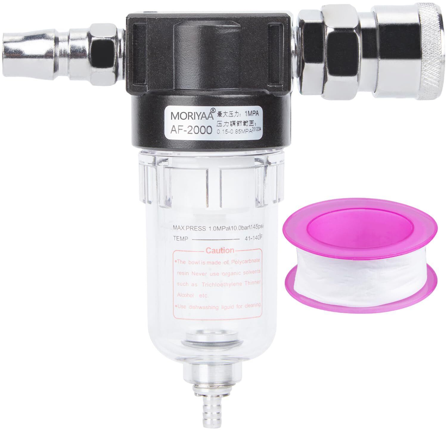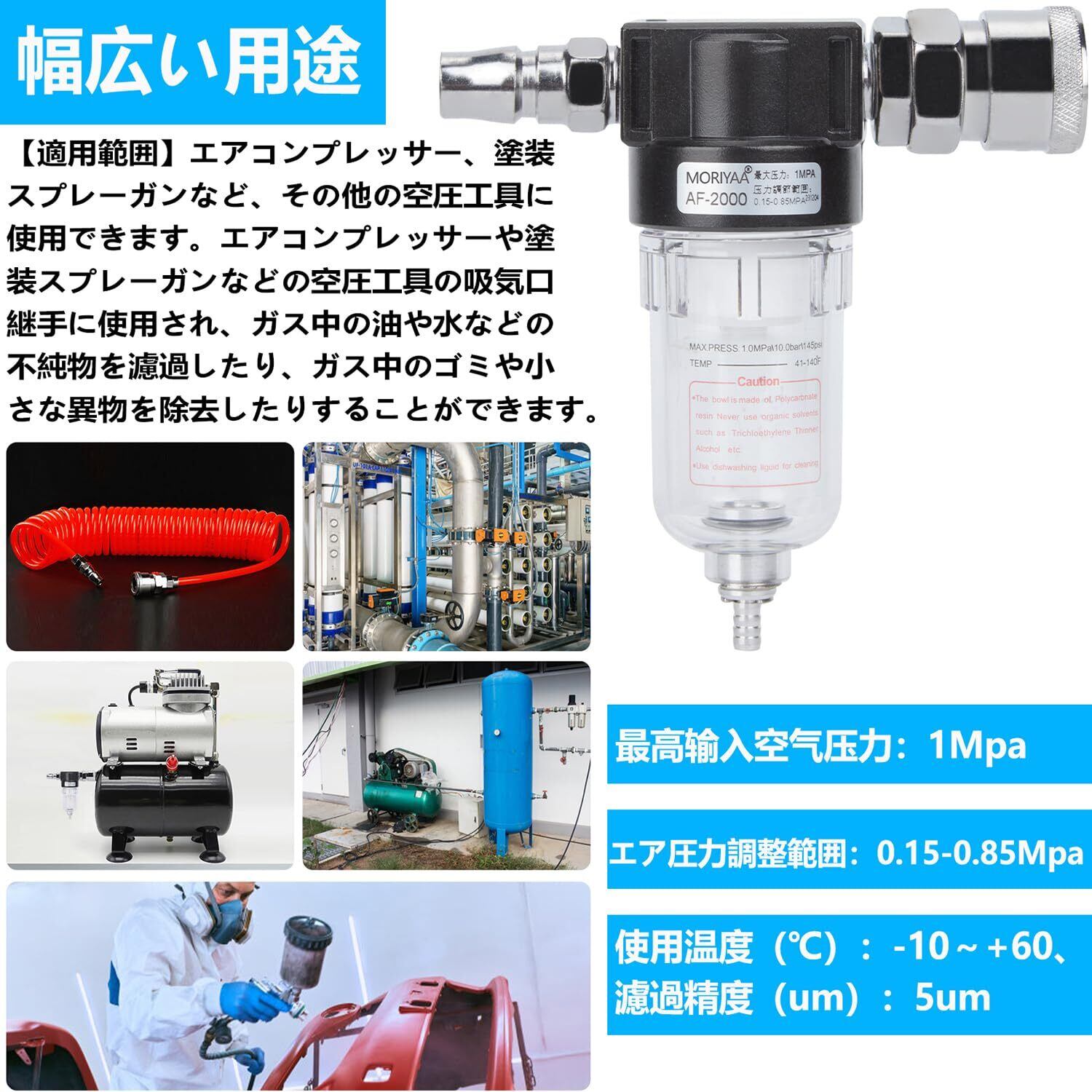 【適用範囲】エアコンプレッサー、塗装スプレーガンなど、その他の空圧工具に使用できます。エアコンプレッサーや塗装スプレーガンなどの空圧工具の吸気口継手に使用され、ガス中の油や水などの不純物を濾過したり、ガス中のゴミや小さな異物を除去したりすることができます。