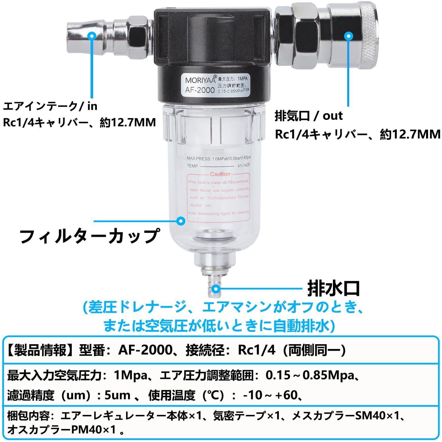【製品情報】型番:AF-2000、接続径:Rc1/4(両側同一)、最大入力空気圧力:1Mpa、エア圧力調整範囲:0.15~0.85Mpa、濾過精度(um):5um 。 / 梱包内容:エアーレギュレーター本体×1、気密テープ×1、メスカプラーSM40×1、オスカプラーPM40×1 。