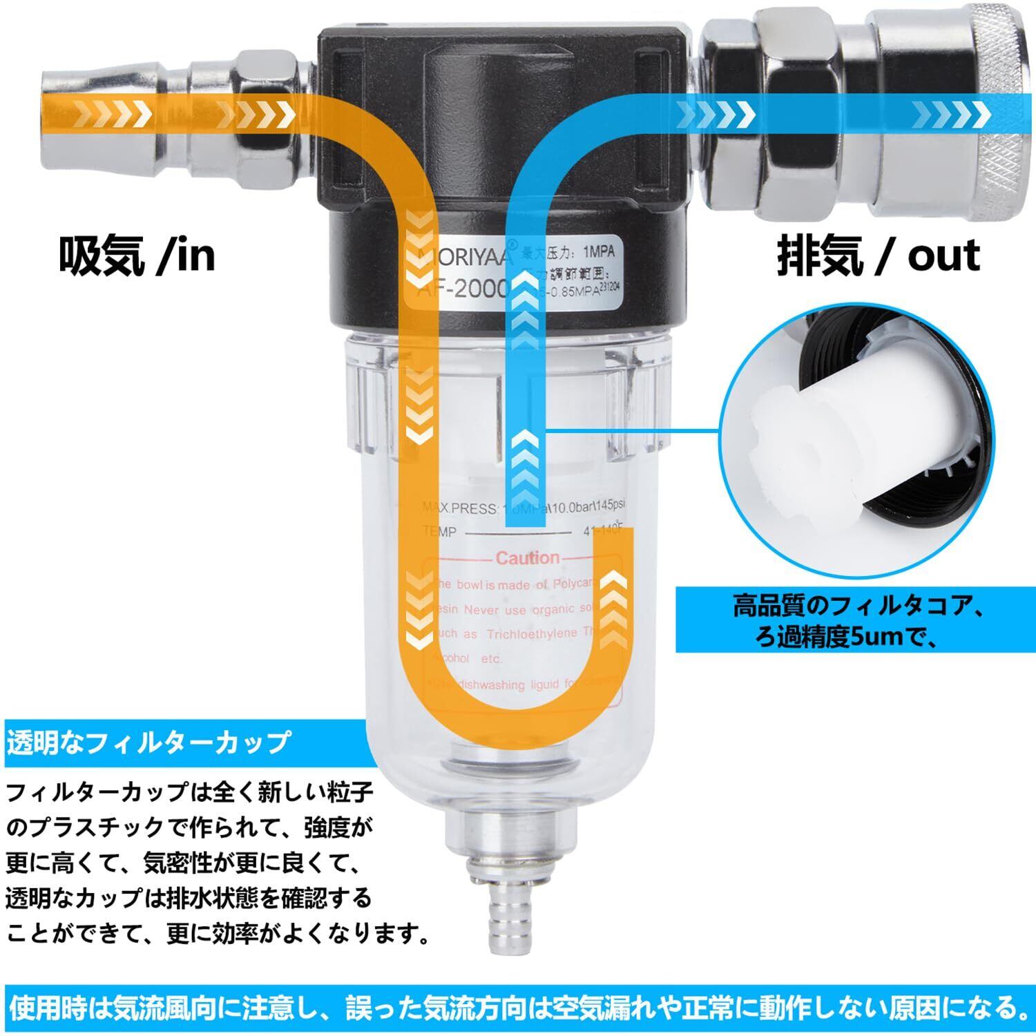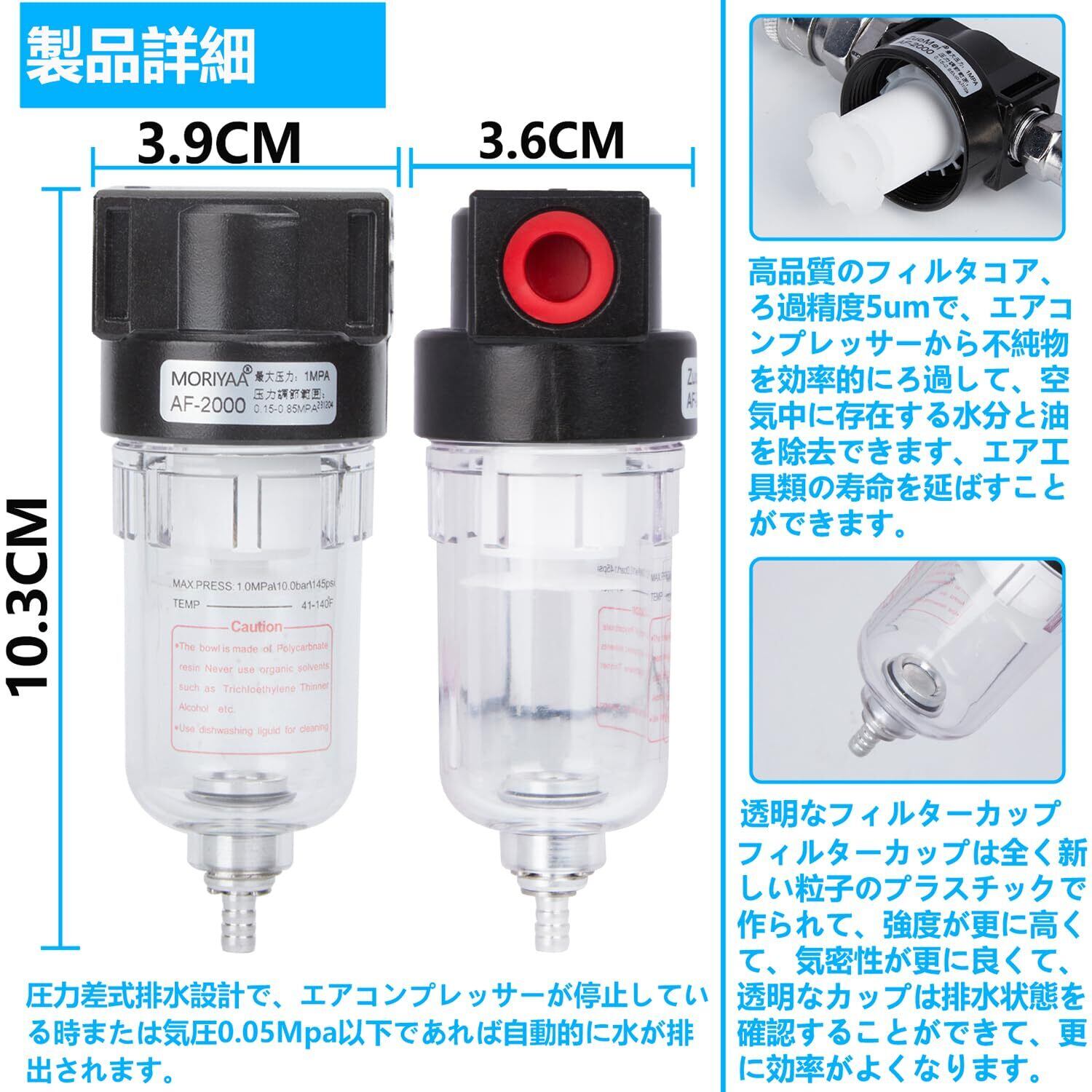 【正確で効果的なろ過】フィルターカップは全く新しい粒子のプラスチックで作られて、強度が更に高くて、気密性が更に良くて、透明なカップは排水状態を確認することができて、更に効率がよくなります。高品質フィルタの濾過精度は5umで、エアコンプレッサーから不純物を効率的にろ過して、空気中に存在する水分と油を除去することができます。エア工具類の寿命を延ばすことができます。