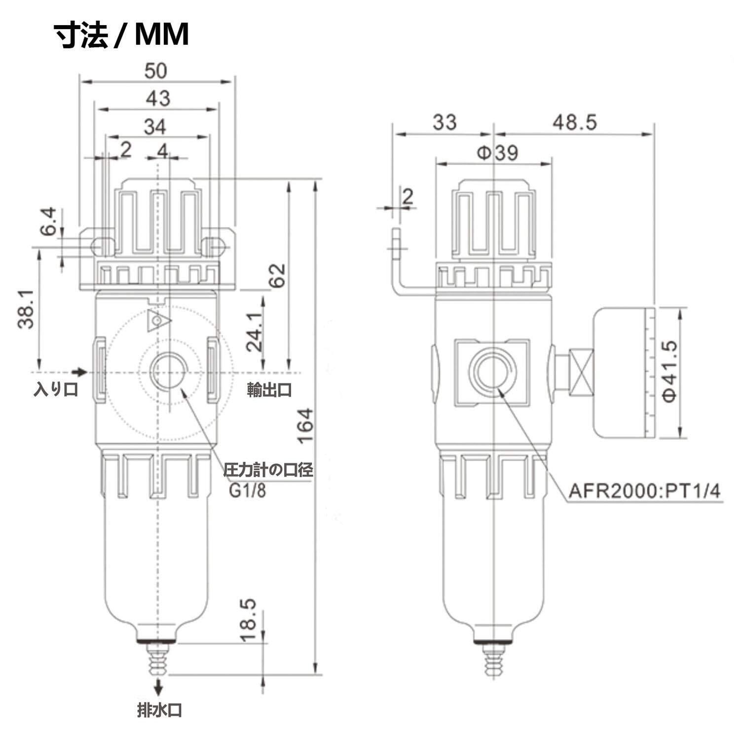 【製品情報】型番:AFR-2000、接続径:Rc1/4(両側同一)、最大入力空気圧力:1Mpa、エア圧力調整範囲:0.15~0.85Mpa、使用温度(℃):-10~+60、濾過精度(um):40um 。 / 梱包内容:エアーレギュレーター本体×1、圧力計×1、オスカプラーPM40×1、メスカプラーSM40×1、気密テープ×1、日本語取扱説明書×1。