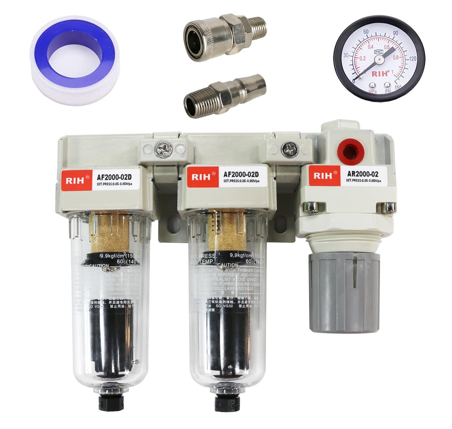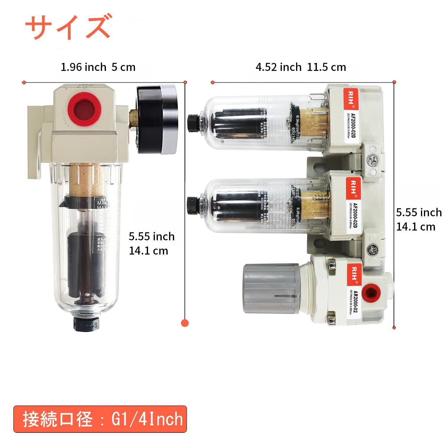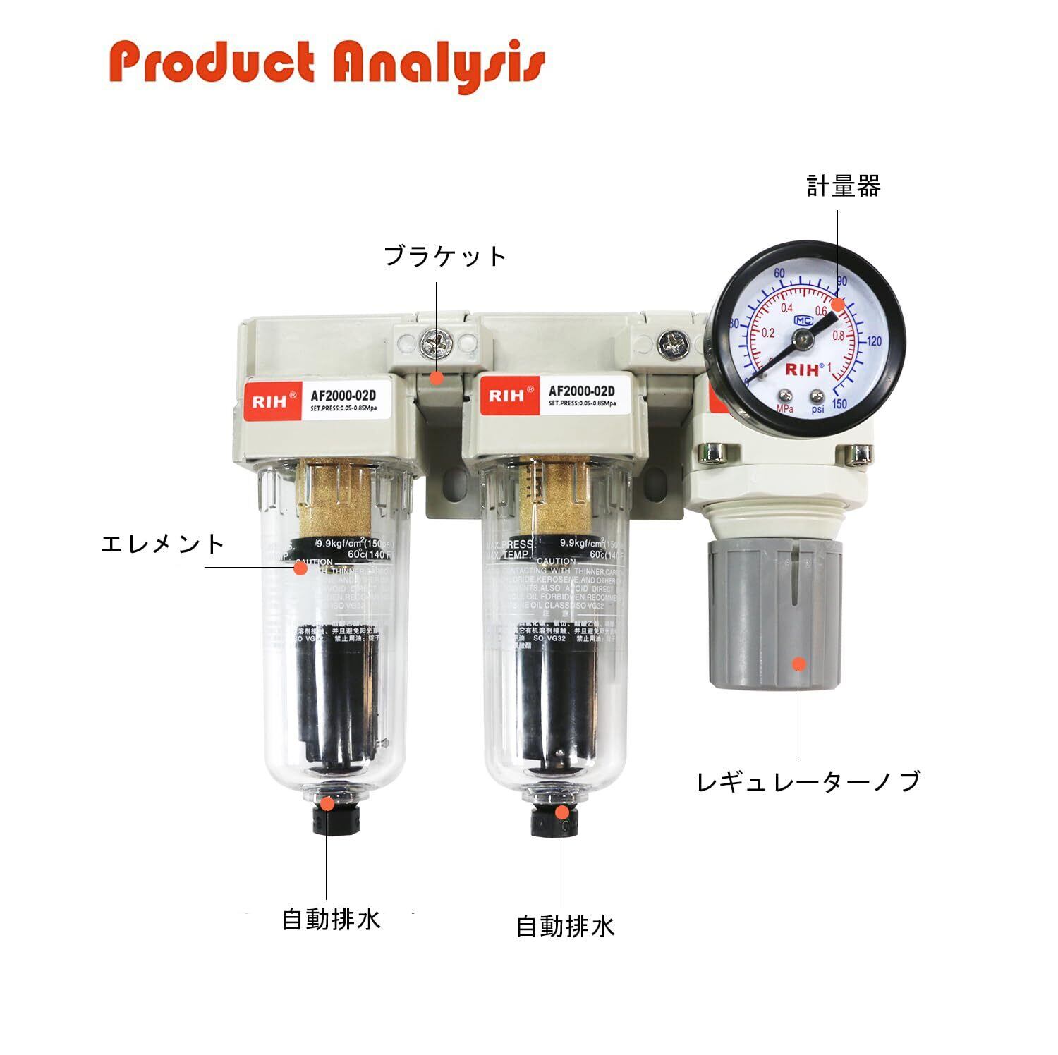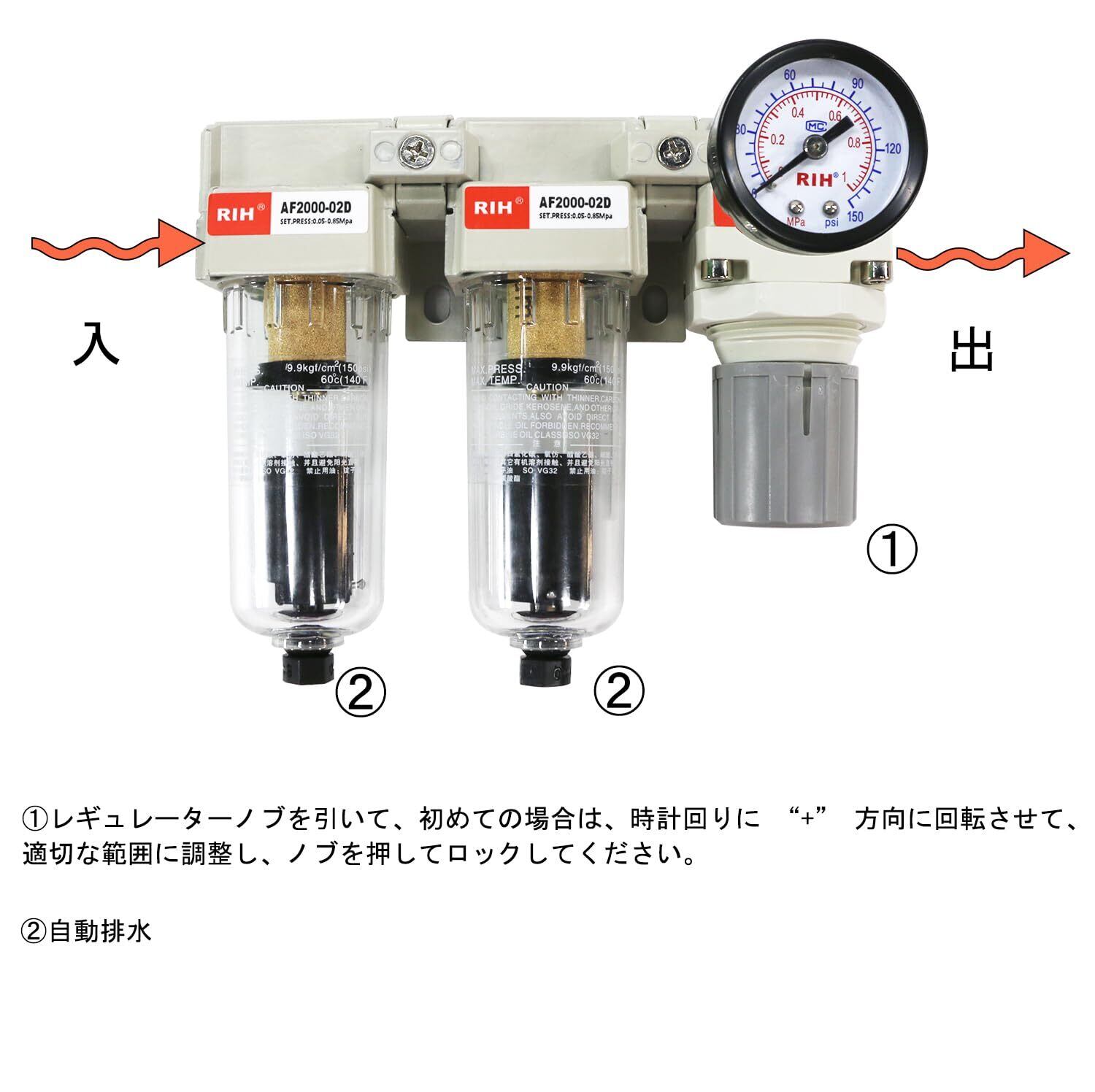 RIH エアーレギュレーター 1/4" フィルターレギュレータ エアコンプレッサー用 水除き ウォーターセパレーター ほこり除き 調圧 圧力設定 圧力計付き カプラー付き 自動排水 (2フィルター1レギュレーター A, 自動排水)