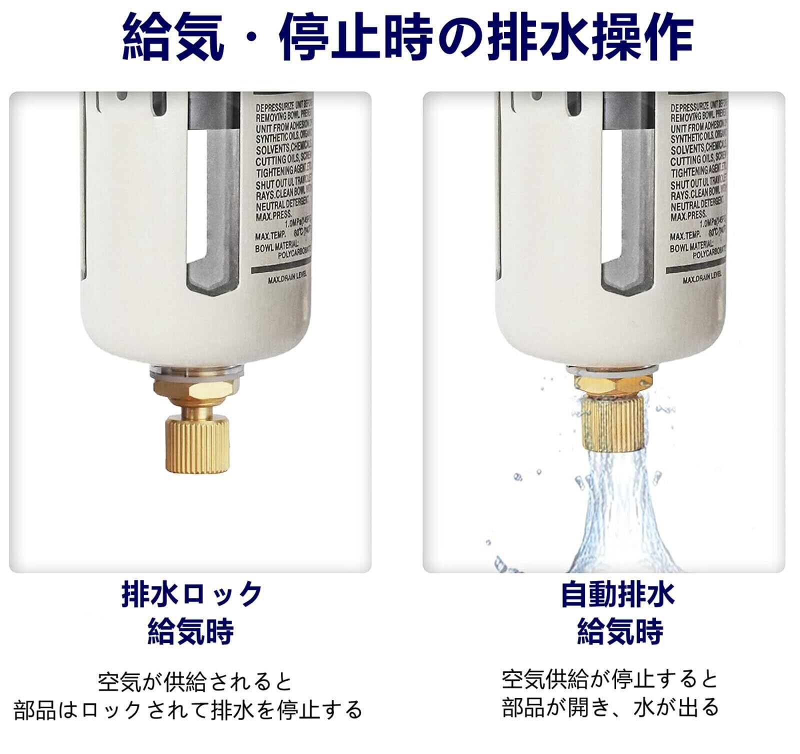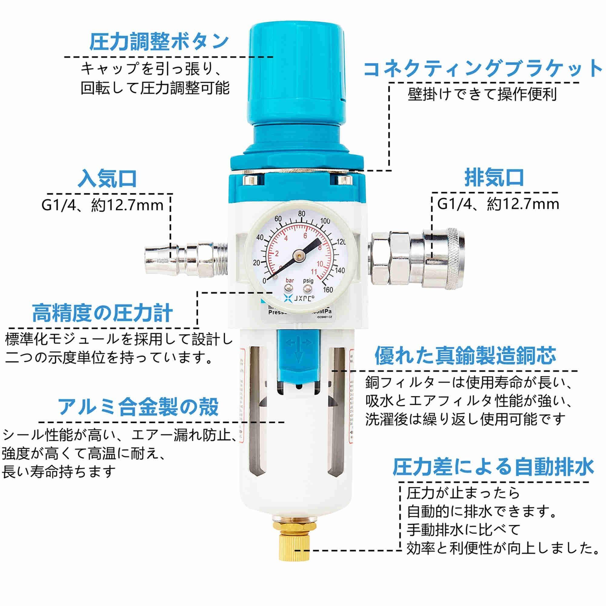 仕様:モデル:JAW3000-02、接続口径:PT1/4、濾過精密度:5~40μm、フィルタ:高品質の真鍮フィルタで作り、調圧範囲:0.05~0.85Mpa、最大調整可能な圧力範囲:0.1MPa、作業温度の範囲:5-60℃、アップグレード製品、自動排水装置付き。