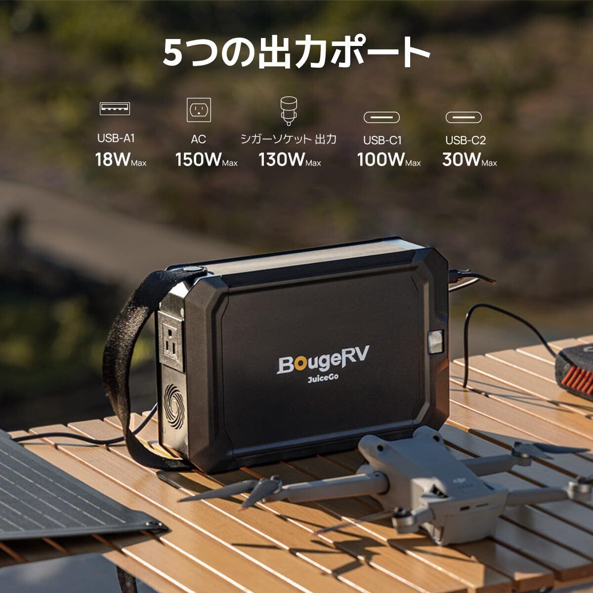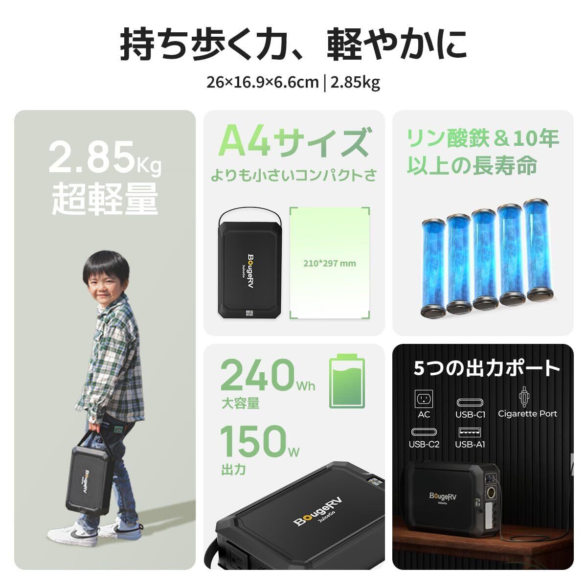 BougeRV ポータブル電源 小型 軽量 240Wh リン酸鉄 ポータブルバッテリー ポタ電 2.85Kg コンパクト 持ち運び便利 純正弦波 100WUSB-C口 パススルー 長寿命 充放電サイクル3500回以上 5つ出力ポート USB/AC/シガーソケット 急速充電 ワーケーション バイクキャンプ 車中泊 アウトドア 停電対策 防災グッズ 非常用電源 JuiceGo