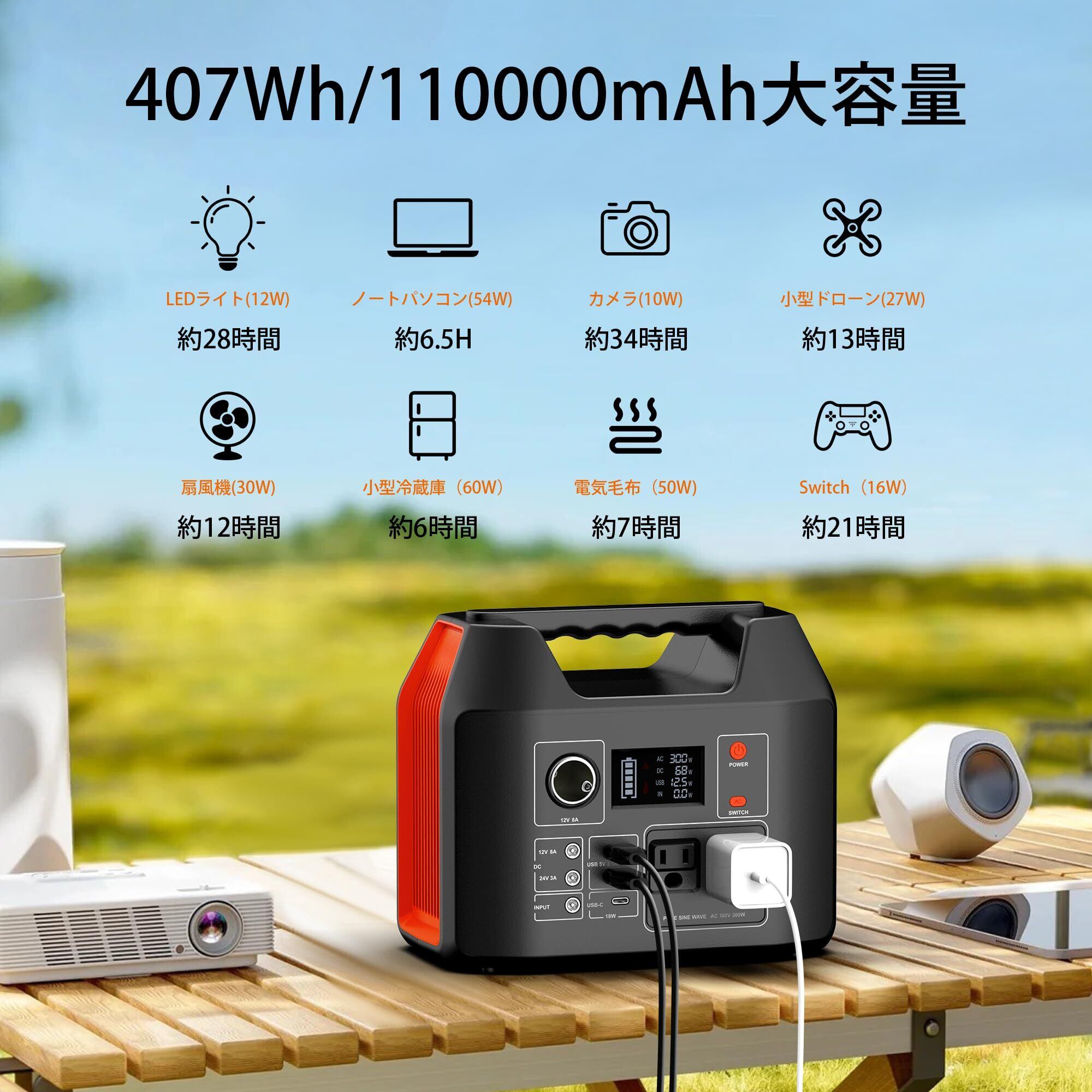 【大容量・純正弦波】407Wh/110,000mAh、AC(定格300W、瞬時最大600W)のポータブル電源です。2つのACコンセントは純正弦波を採用しており、家庭用100Vと同じような滑らかな波形を作り出す交流電源で、パソコンやスピーカーなどほとんどの精密機器が問題なく使えます。LEDライト(5W)が約70時間、携帯電話(12W)が約30-35回、Switch(18W)が約15-20回、ノートパソコン(50W)が約5-7回、小型ドローンが約5-7回、ミニ冷蔵庫(40W)が約7-9時間給電できます。キャンプ、車中泊、アウトドア災害時などで大容量蓄電池が使えて便利です。