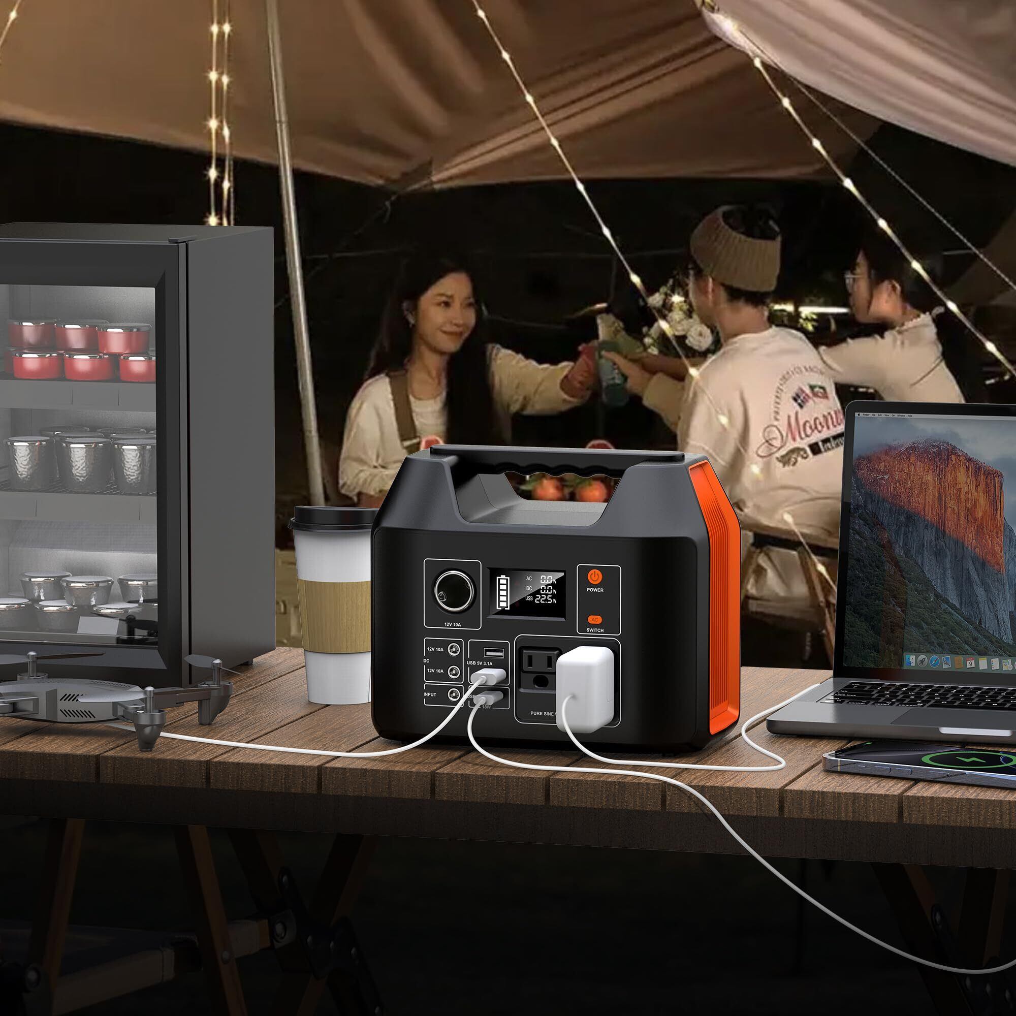 【LCD大画面表示・LEDライト】 ポータブル蓄電池は柔らかな暖色で辺りを照らすイルミネーションやストローブやSOS用フラッシュとして使用可能なLEDライトを本体正面に搭載し、キャンプから防災まで幅広く活躍でき、読書灯としても使用可能。本体前面に大きいLCD画面を装備しバッテリー残量や入出力のワット数が一目瞭然。※注意:LEDライトを人や動物の目に直接に当てないでください。