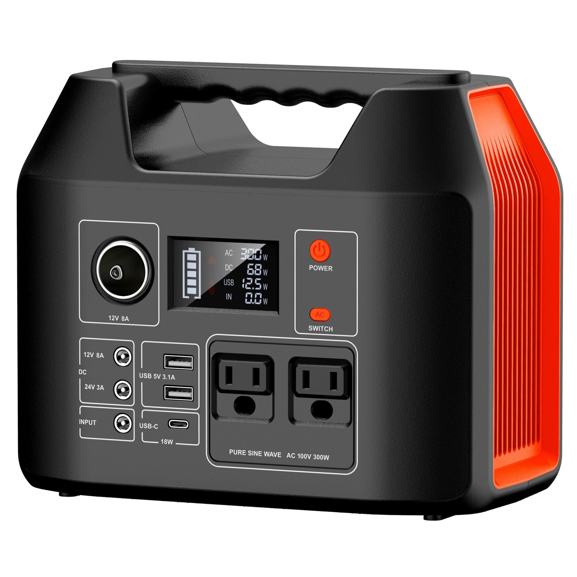 【最大300wの機器に給電でき】ポータブルバッテリーは最大300wの機器に給電できます。この製品は高品質のリチウムイオン電池を内蔵しており、メモリ効果はありません。最高な効果を得るために、10℃~30℃の範囲での使用をお勧めします。充電中の干渉を避けるために、テレビ、ラジオやその他の機器から離れてください。短絡の危険を避けるために、この製品をコイン、ジュエリー、キー、他の金属のものから離れてください。】