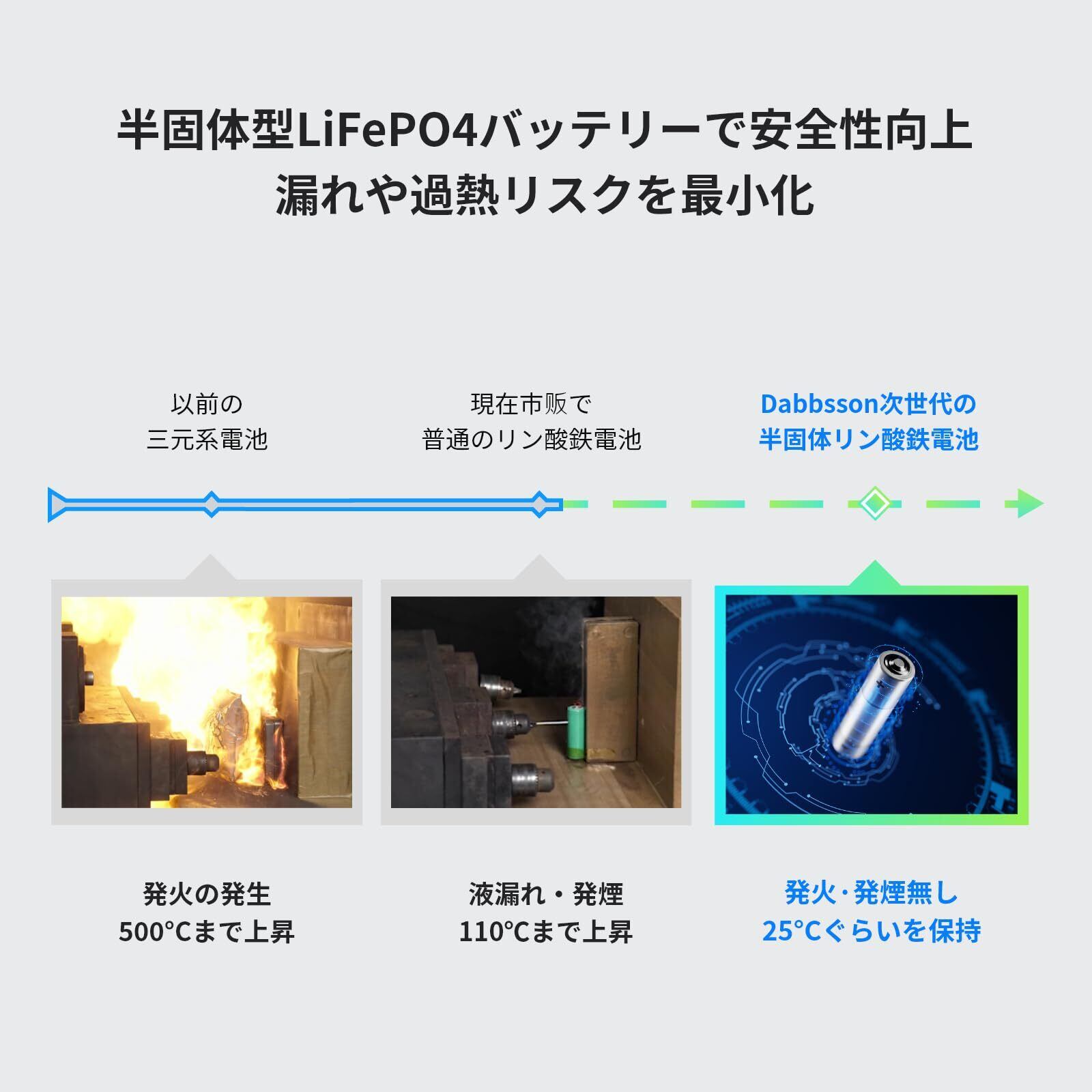 【軽量&便利!10年使える耐久性半固体バッテリー】Dabbsson 300Eは336Whの容量に加え、300Wの定格出力を誇ります。ダブソン全製品の中で最も軽量なモデルで、わずか4.3kg。子猫ほどのサイズでキャンプや車中泊、RV旅行など、非常にコンパクトで便利です。4,000回の充放電サイクル、長期使用に強い、半固体LiFePO4電池を採用し、釘刺し試験に合格し、安全性が高い、4,000回の充放電サイクルに対応、10年の長期使用でも容量の80%以上を維持