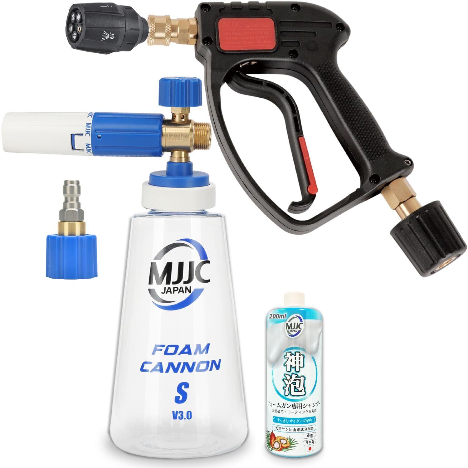MJJC 第3世代 フォームキャノンS V3.0【フォームガン + ショートガン (ケルヒャークイックコネクト用) 洗車セット】洗車用品 泡 ノズル 高圧洗浄機 1/4クイックカプラ(海外規格) アダプター、神泡シャンプーお試し200ml付属 (【セット商品】フォームキャノンS V3.0(青)+ショートガンPRO)