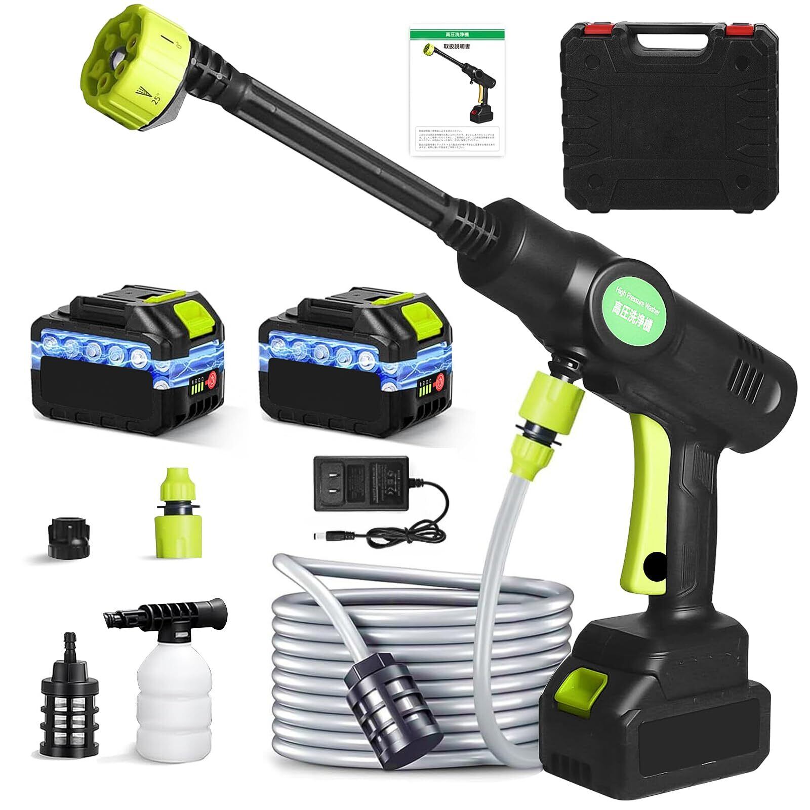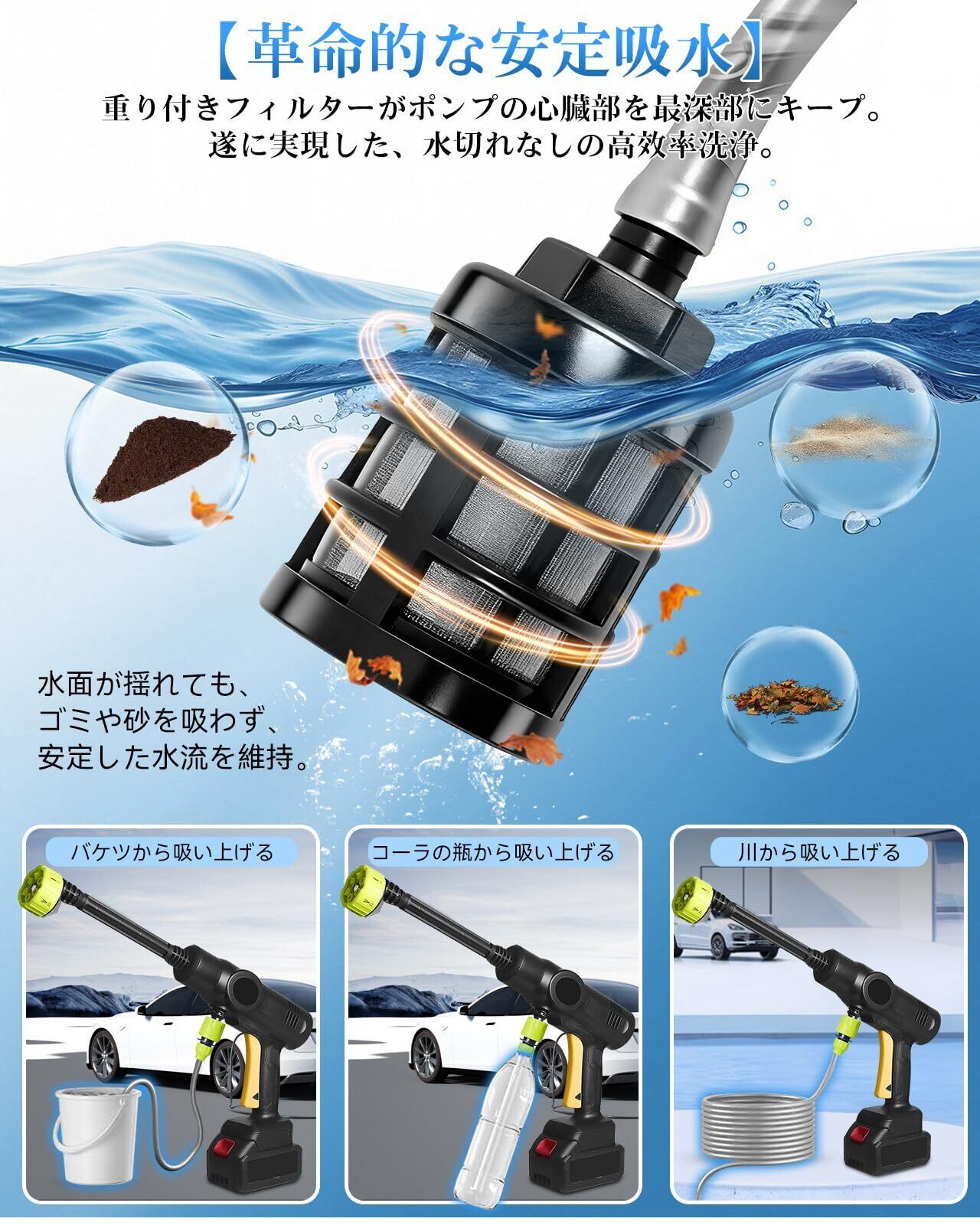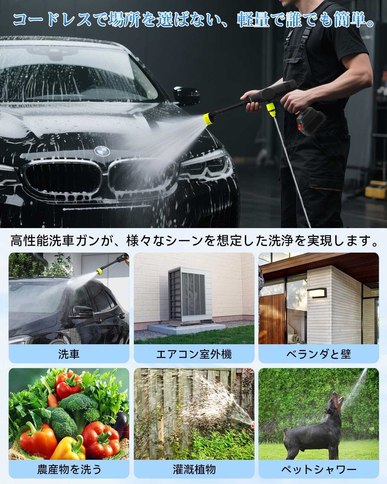 【効率的に洗浄】高圧洗浄機の魅力は、水をかけるだけで簡単に掃除できることです。66.9%の水使用量を削減しながら、頑固な汚れを強力な水圧でしっかり取り除きます。この高圧洗浄機は壁の隅の隙間でも、車のタイヤのホイールでもきれいに洗浄でき、庭の花やペットのお風呂や水遊びにも使用でき、5 mのホースが装備されているため、水を戻すことはできません エレクトロニクス。 【複数の適用シーン&使い勝手】給水ホースをバケツや池に入れた水を汲むだけで、水のある場所でも使える高圧洗浄機です。フィルターはろ過機能があるため、湖、川、貯蔵された雨水にも使用できる。同時に私たちは水道代を節約することができます。5メートルの軟水管も備えており、水の汲み取りや移動に便利です エレクトロニクス。 【6in1 多機能ノズル】このコードレス高圧洗浄機は0°/15°/25°/40°/シャワー/ファンなど6種類のモードを1つのノズルに合わせた。ノズル先端を回転させることで噴射角度を切り替えます。洗車、ガーデン、アウトドア、階段、網戸と窓ガラス、レンガ壁【6in1 多機能ノズル】このコードレス高圧洗浄機は0°/15°/25°/40°/シャワー/ファンなど6種類のモードを1つのノズルに合わせた。ノズル先端を回転させることで噴射角度を切り替えます。洗車、ガーデン、アウトドア、階段、網戸と窓ガラス、レンガ壁、外壁、駐車場、玄関、自転車とバイク、ベランダ、高台、家の周り、年末の大掃除、キャンプ用品の清掃、BBQの清掃など、さまざまな洗浄シーンに適応することができます。発泡ガンモードに変更することもでき、洗浄剤をボトルに入れて高圧洗浄機に取り付けるだけで、使いやすい エレクトロニクス。、外壁、駐車場、玄関、自転車とバイク、ベランダ、高台、家の周り、年末の大掃除、キャンプ用品の清掃、BBQの清掃など、さまざまな洗浄シーンに適応することができます。発泡ガンモードに変更することもでき、洗浄剤をボトルに入れて高圧洗浄機に取り付けるだけで、使いやすい エレクトロニクス。 【安全性と信頼性&高いアフターサービス】洗車店監修!信頼性の高い高圧洗浄機は新たにアップグレードされたブラシレスモータを搭載し、多種のノズルヘッドに合わせて、どんな頑固な汚れも洗浄することができます。製品は90日間の品質を享受して、私達は優秀な製品のアフターサービスチームを持って、いかなる製品の使用あるいは品質の問題、あなたがすぐに私達と連絡することができること(Tips:製品出荷時に様々な機能や細部の検査を経て、水汚れが出るのは正常な現象です。ご不満の場合は、オペレーターにご連絡いただき返品・返金をお願いいたします) エレクトロニクス。
