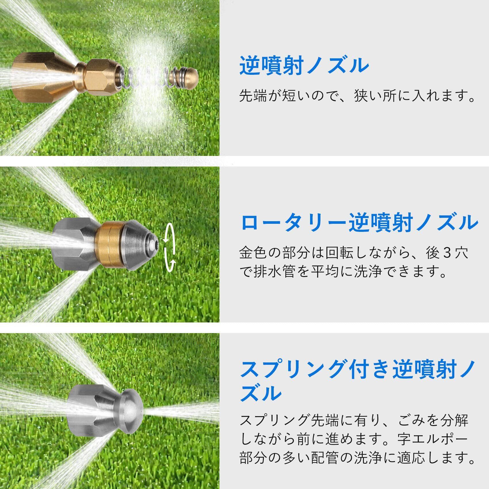 【改善①ノズルの数と形を改善して清掃能力は再び強化されケルヒャー配管洗浄ホース】パイプクリーニングホースは3種類スプレーノズルを持ち、高圧洗浄ホースの清掃と推進能力を備えています。逆噴射ノズルとロータリーノズル先端は平やらな形を改善して尖った形で採用しています。狭いところ、 エルボーの入りをもっと易くなります。スプリング付き逆噴射ノズルにはスプリング先端に有り、ごみを分解しながら前に進めます。孔からと異なる方向から、水を噴射します。これによってパイプは圧力落ず、複雑な配管、枝管から本管まで、配管内の汚れ・詰まりを綺麗に洗浄します。